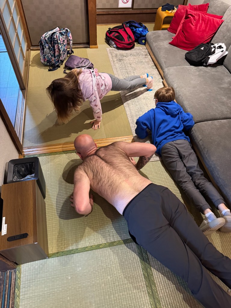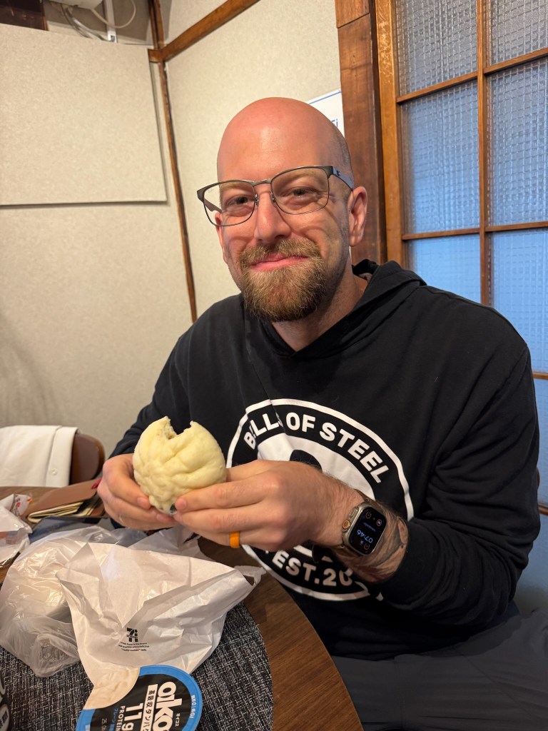 We woke up on our first full day in Japan — some of us much earlier than others, thanks to jet lag. Tom and the kids headed out on a mission: their very first conbini (convenience store) run to the local 7-Eleven. They returned victorious, arms full of goodies for breakfast.