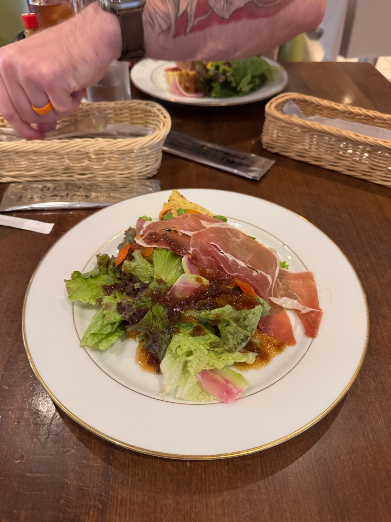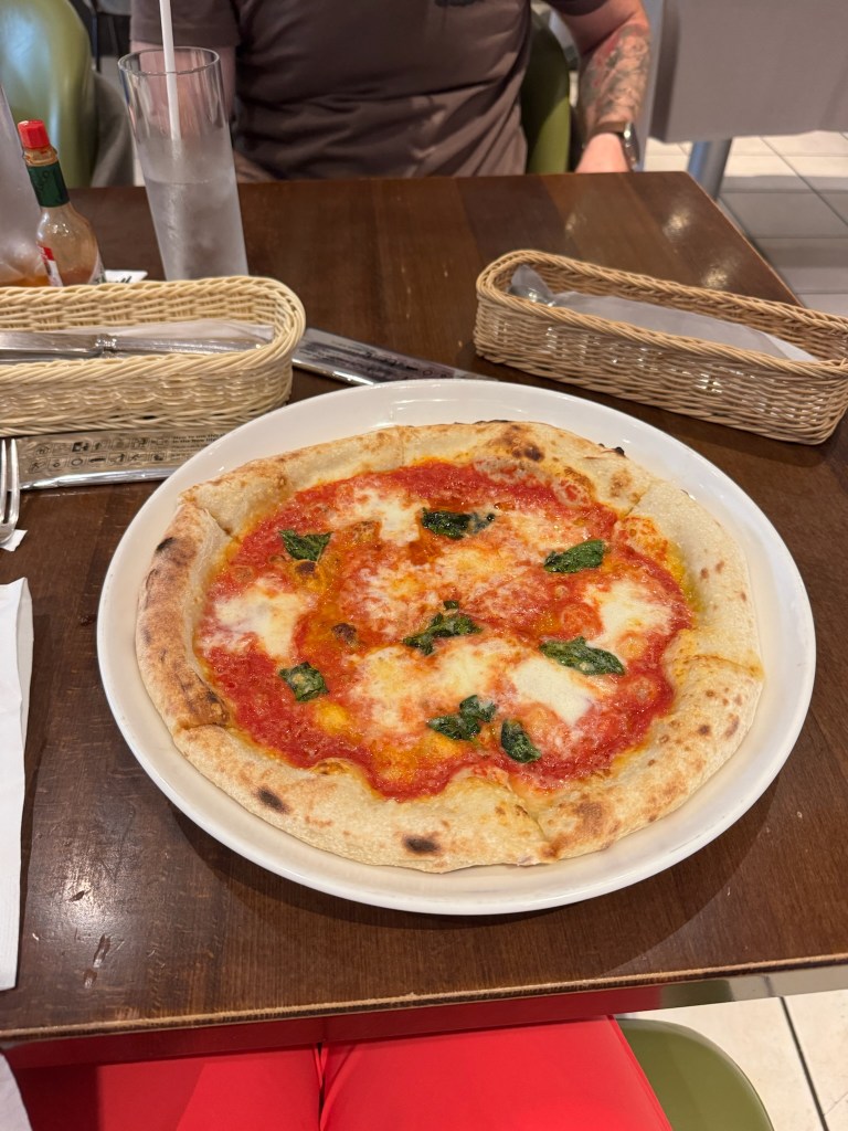 Hunger hit hard after Itoya, so we wandered over to a nearby mall and rode the escalator up to the food floor. We landed at a fantastic Italian restaurant — and shockingly, lunch for all four of us only cost about $30. Carlynn and Charlie split a Margherita pizza, Tom had a sausage pizza, and I got my own Margherita. The meal started with an appetizer plate: prosciutto, salad, and a frittata. There was also a self-serve drink station — water for Tom and me, grape juice for Carlynn, and orange juice for Charlie.