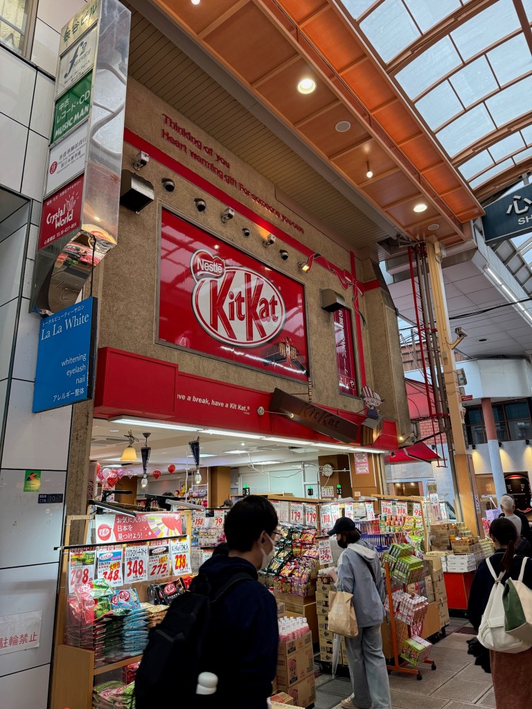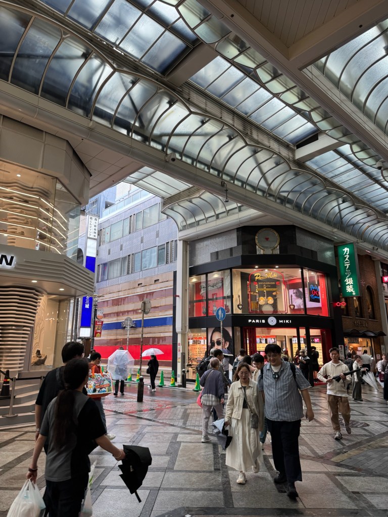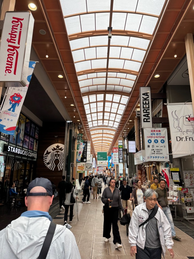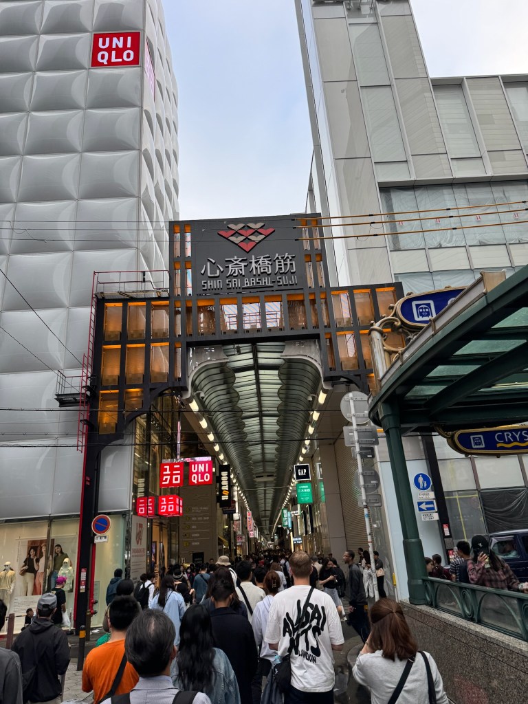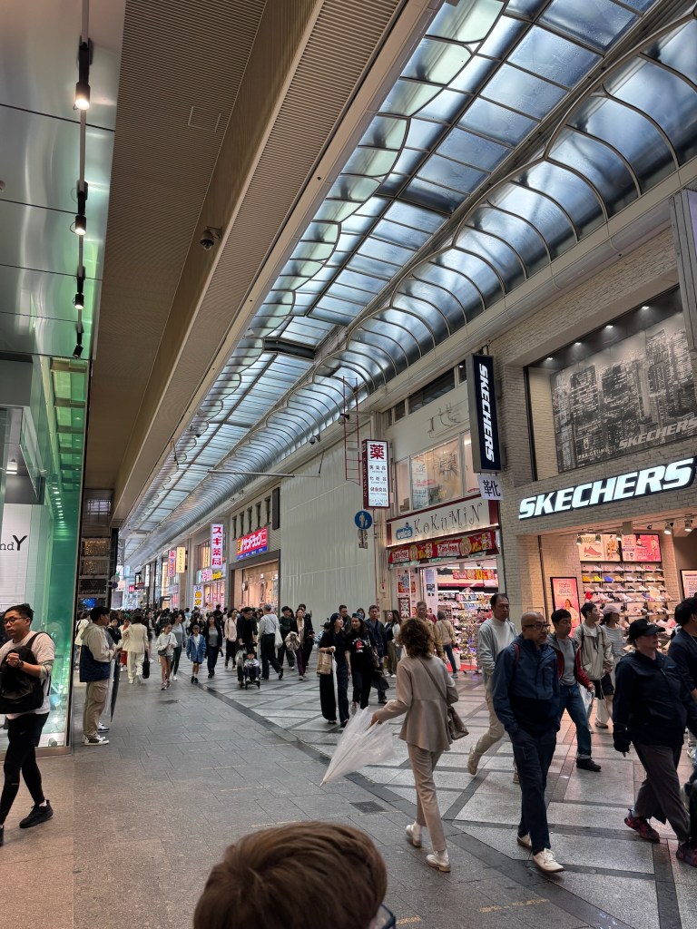 Since we hadn’t packed any jackets, and it was surprisingly chilly and windy, we wandered through a mall connected to the station looking for something warm. That led us straight to Shinsaibashi-suji, a covered shopping street that goes on forever. With tons of stores — from Uniqlo to tiny local shops and sweet stalls — and a glass roof overhead, it’s perfect even when it’s raining.