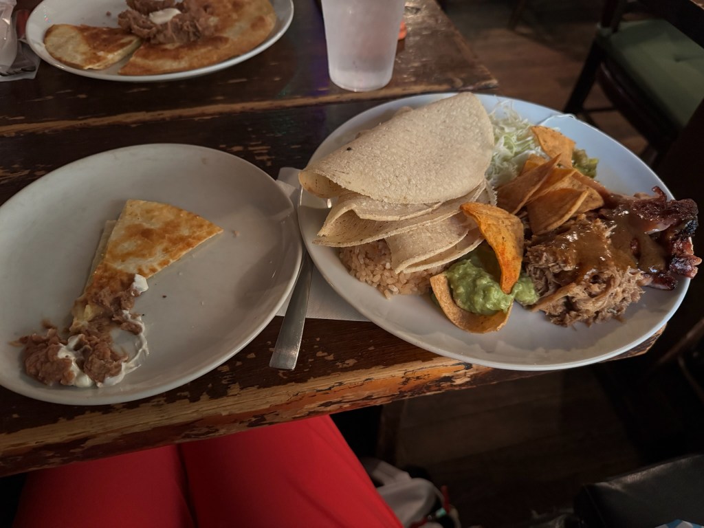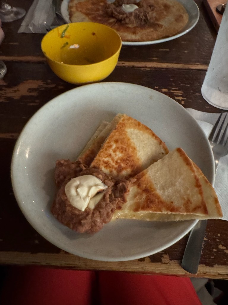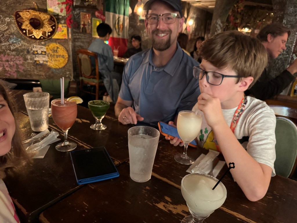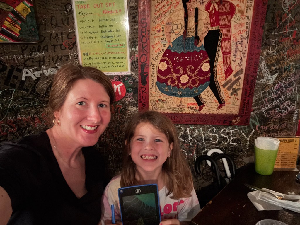 I had a lychee margarita, Tom had a matcha margarita (not my thing, so I didn’t try it), and the kids had frozen lychee and strawberry lemon drinks. For food, I went all in — salad, half a cheese quesadilla, meat, beans, rice, and taco shells. The salad dressing was incredible, the beans were rich and flavorful, and the rice… oh my gosh. Sticky Japanese-style Mexican rice?! Heaven.