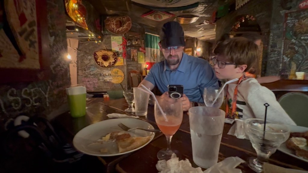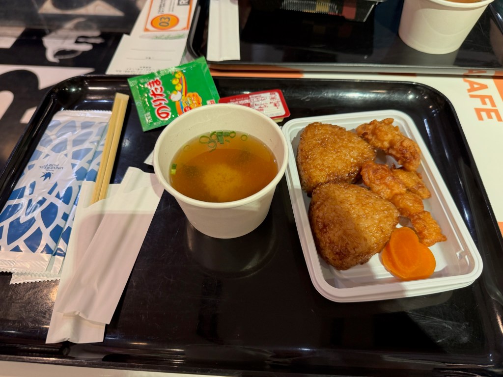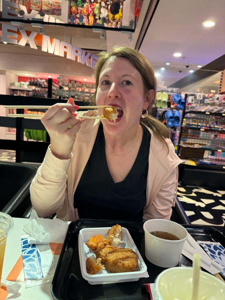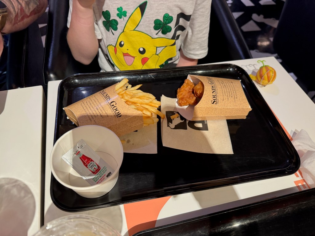 When we arrived at Universal City Station, it was chaos — crowds leaving Universal Studios around 8 p.m. It was overwhelming, and we were exhausted. We got checked into our hotel and took a few lobby photos before heading to the on-site restaurant for dinner. Carlynn had a cute kids’ meal, Charlie and I had fried chicken, and Tom tried a grilled rice ball. Everything was solid.