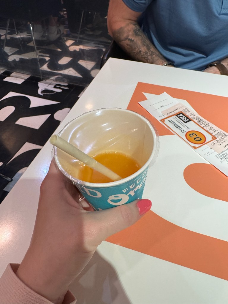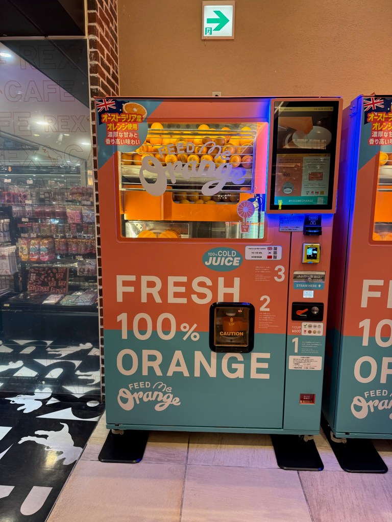 We grabbed a fresh-squeezed orange juice from a vending machine next to the restaurant — and wow, it was amazing. So fresh and delicious!
