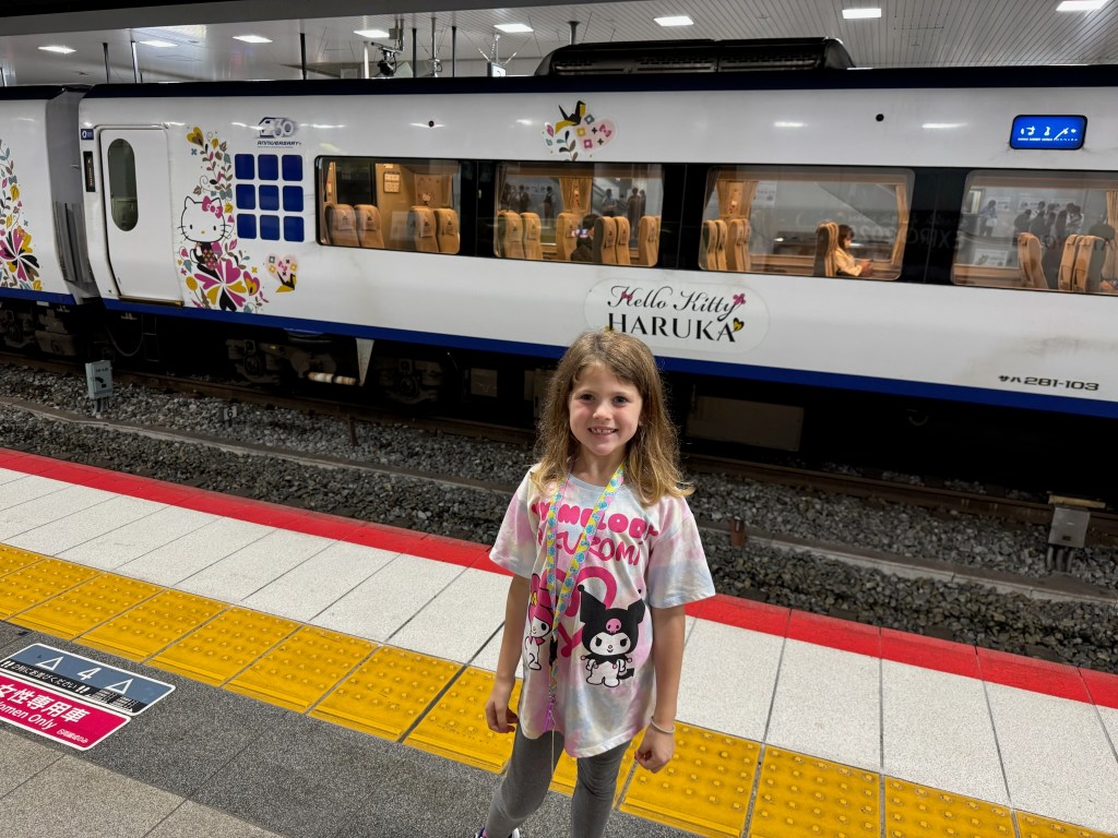 We boarded the train to Universal City and waited in a cozy indoor waiting area. Across the platform, we spotted a Hello Kitty-themed train — pink and adorable inside and out. Naturally, I took Carlynn out to get a picture with it.
