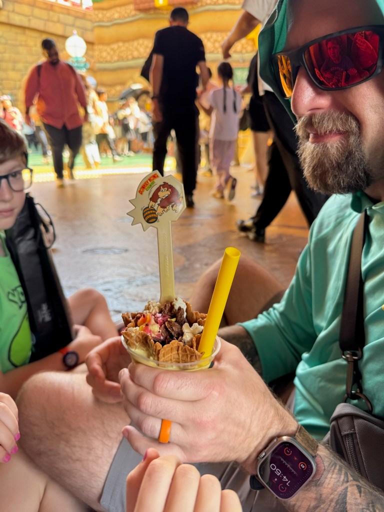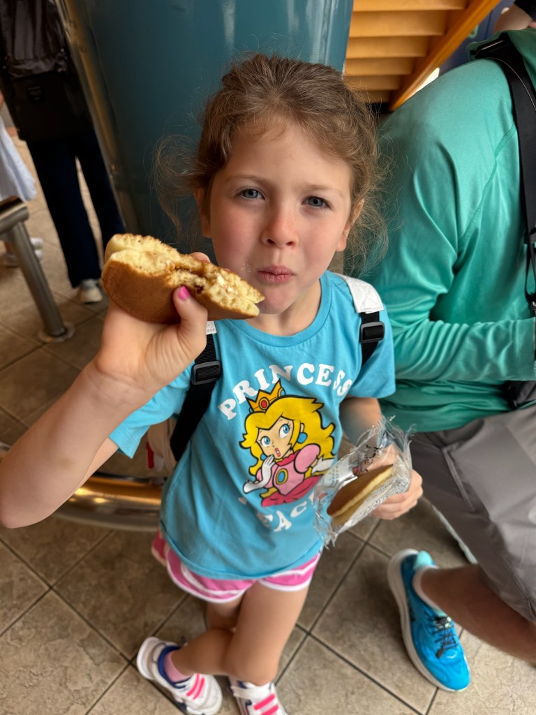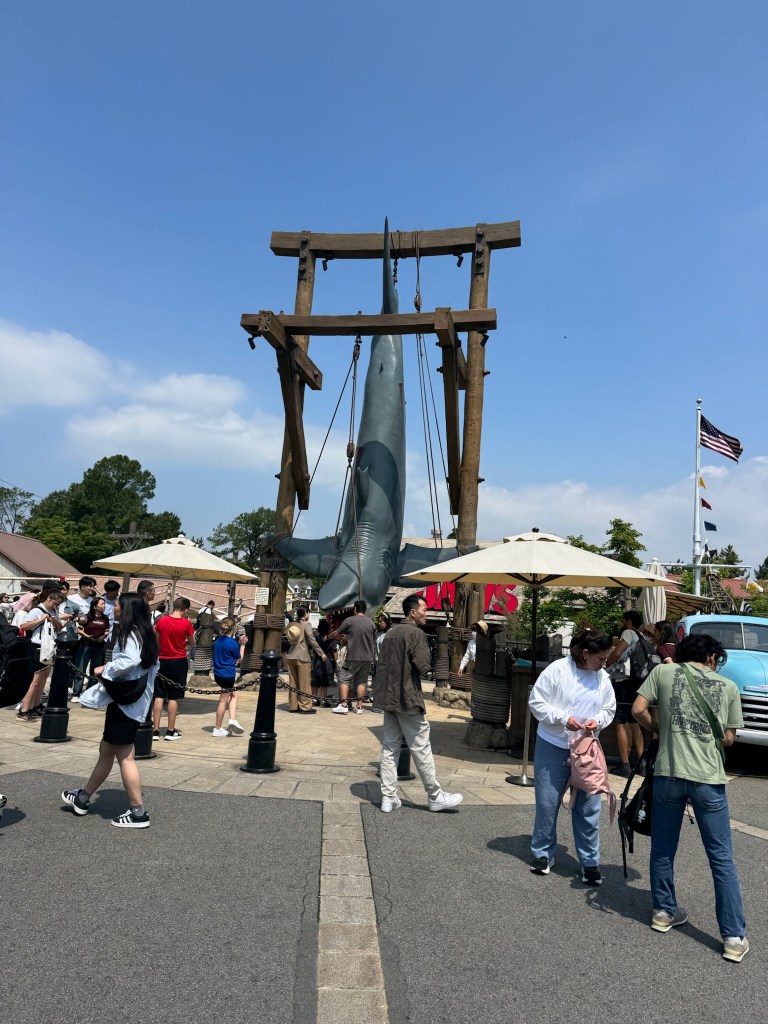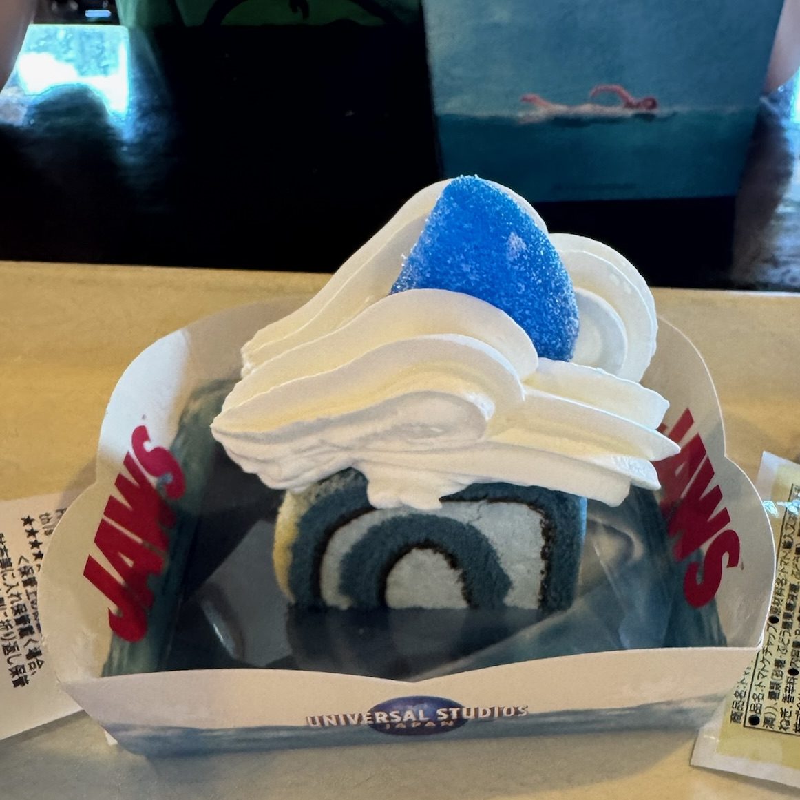 At that point, I was hungry and really needed food. Tom steered us toward the Jaws-themed area to eat, but the food options were…interesting. I went with fried chicken (super greasy), and the kids got “shark nuggets.” Yep—actualshark. I gave it a try. Let’s just say it wasn’t for me (or Carlynn). We made her eat two anyway—she was a champ. I couldn’t have done it. We also shared a desert that was like a swiss roll, but different flavor with whipped cream and a blue shark fin gummy. It wasn’t our favorite.
