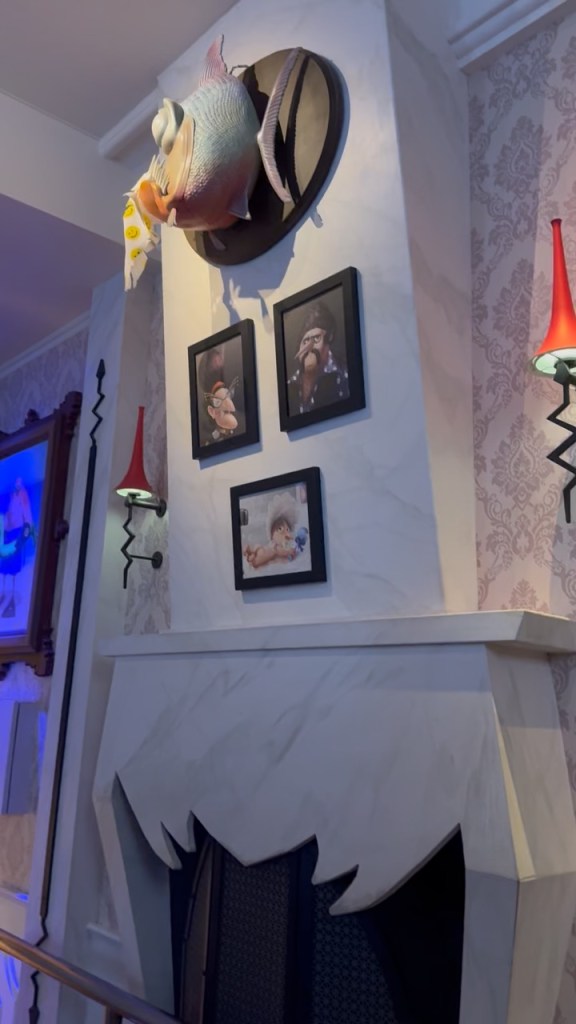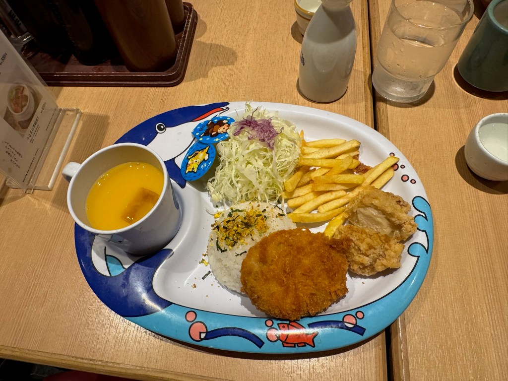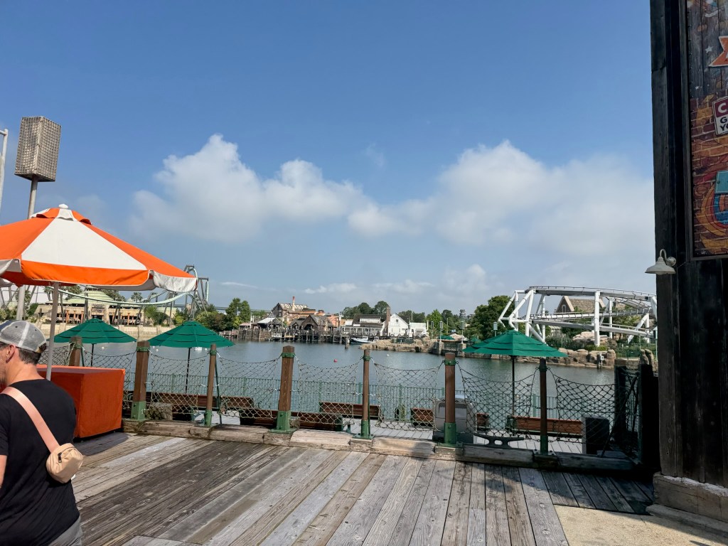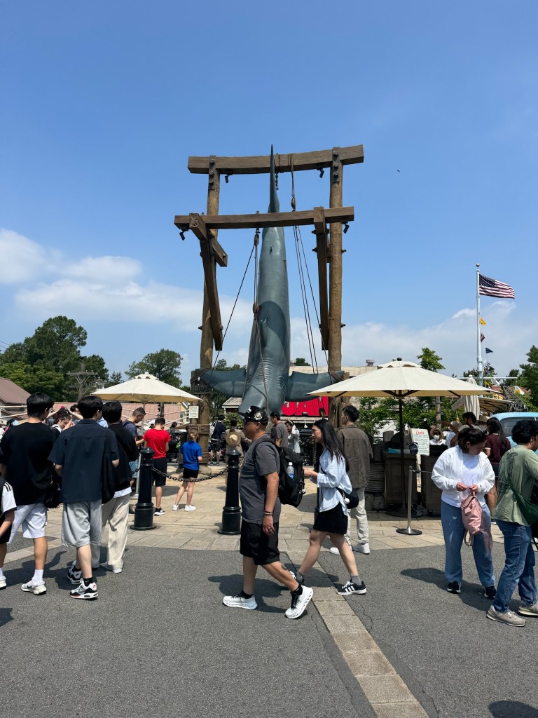 At that point, I was hungry and really needed food. Tom steered us toward the Jaws-themed area to eat, but the food options were…interesting. I went with fried chicken (super greasy), and the kids got “shark nuggets.” Yep—actualshark. I gave it a try. Let’s just say it wasn’t for me (or Carlynn). We made her eat two anyway—she was a champ. I couldn’t have done it. We also shared a desert that was like a swiss roll, but different flavor with whipped cream and a blue shark fin gummy. It wasn’t our favorite.