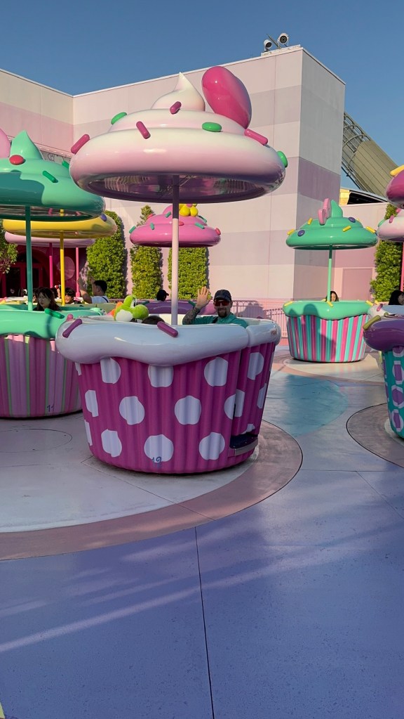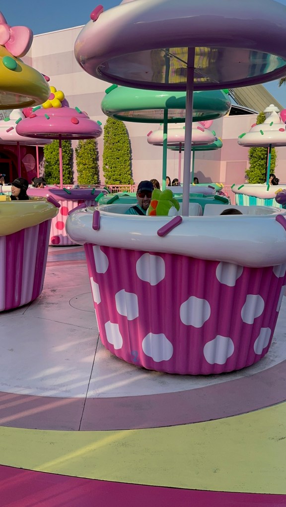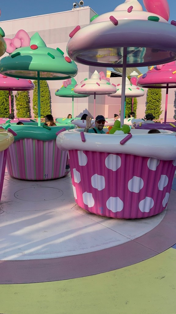 Eventually, they showed up and took Carlynn on the Hello Kitty cupcake ride. She loved it. Meanwhile, Tom and Charlie filled us in on their pterodactyl ride—which apparently rotates so you’re lying down and flying like a real dino! They thought it was awesome.