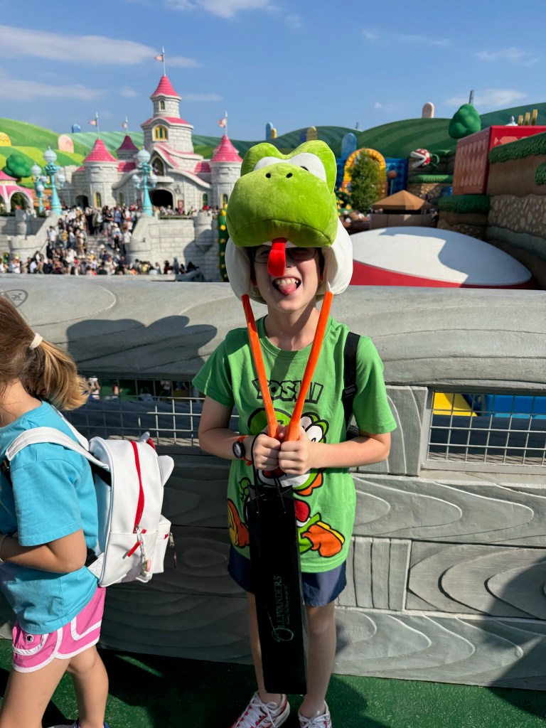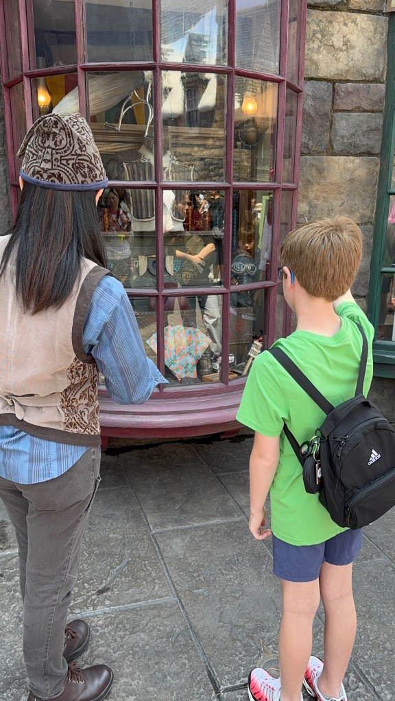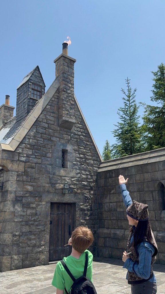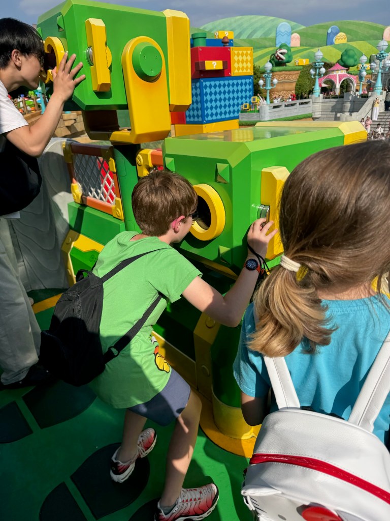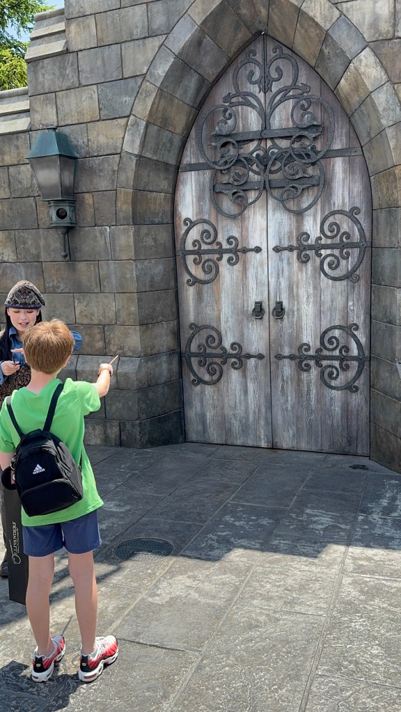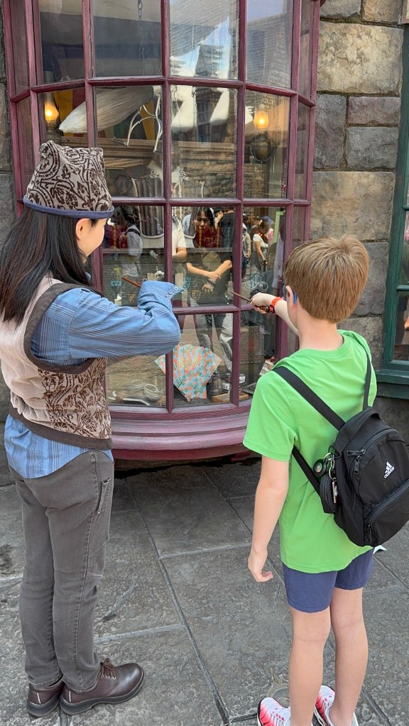 Next up: The Wizarding World of Harry Potter! We had a timed entry pass and couldn’t wait to step into Hogsmeade. It felt like we walked into the movies. Charlie bought a wand and practiced interactive spells while Tom grabbed us two Butterbeers (delicious!). He struggled with some of them but did great lighting the fire! We rode both Harry Potter attractions, then it was nearly time for our entry window into Super Nintendo World.