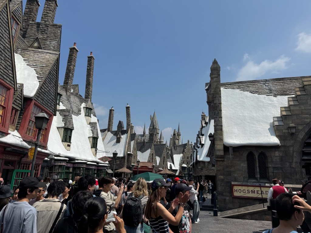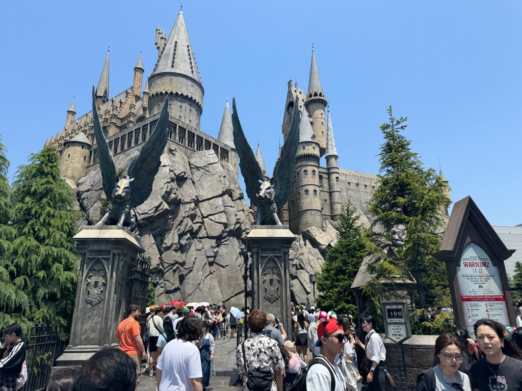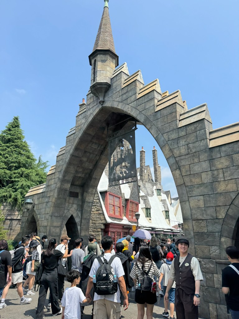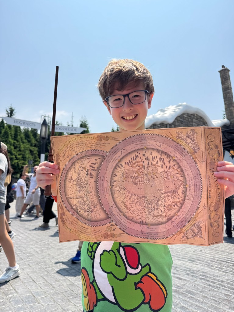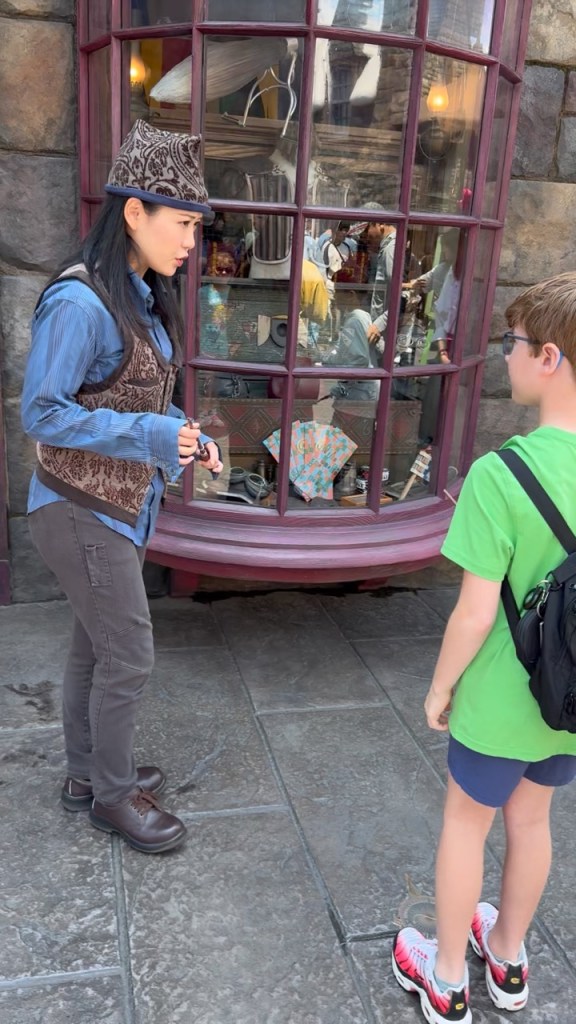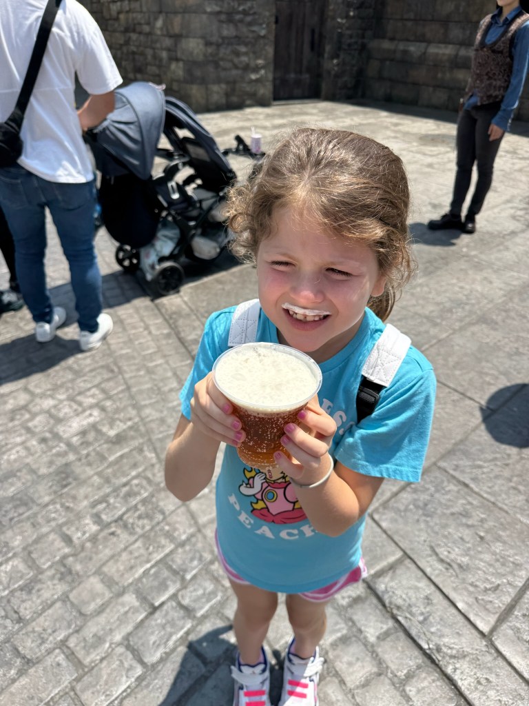 Next up: The Wizarding World of Harry Potter! We had a timed entry pass and couldn’t wait to step into Hogsmeade. It felt like we walked into the movies. Charlie bought a wand and practiced interactive spells while Tom grabbed us two Butterbeers (delicious!). He struggled with some of them but did great lighting the fire! We rode both Harry Potter attractions, then it was nearly time for our entry window into Super Nintendo World.