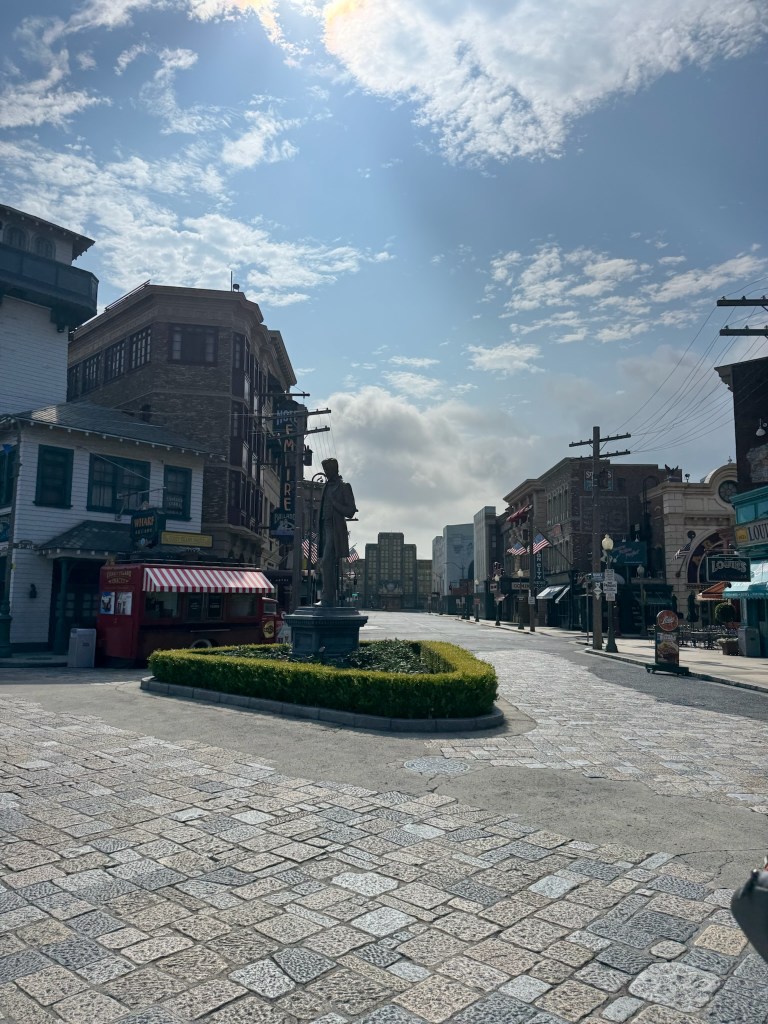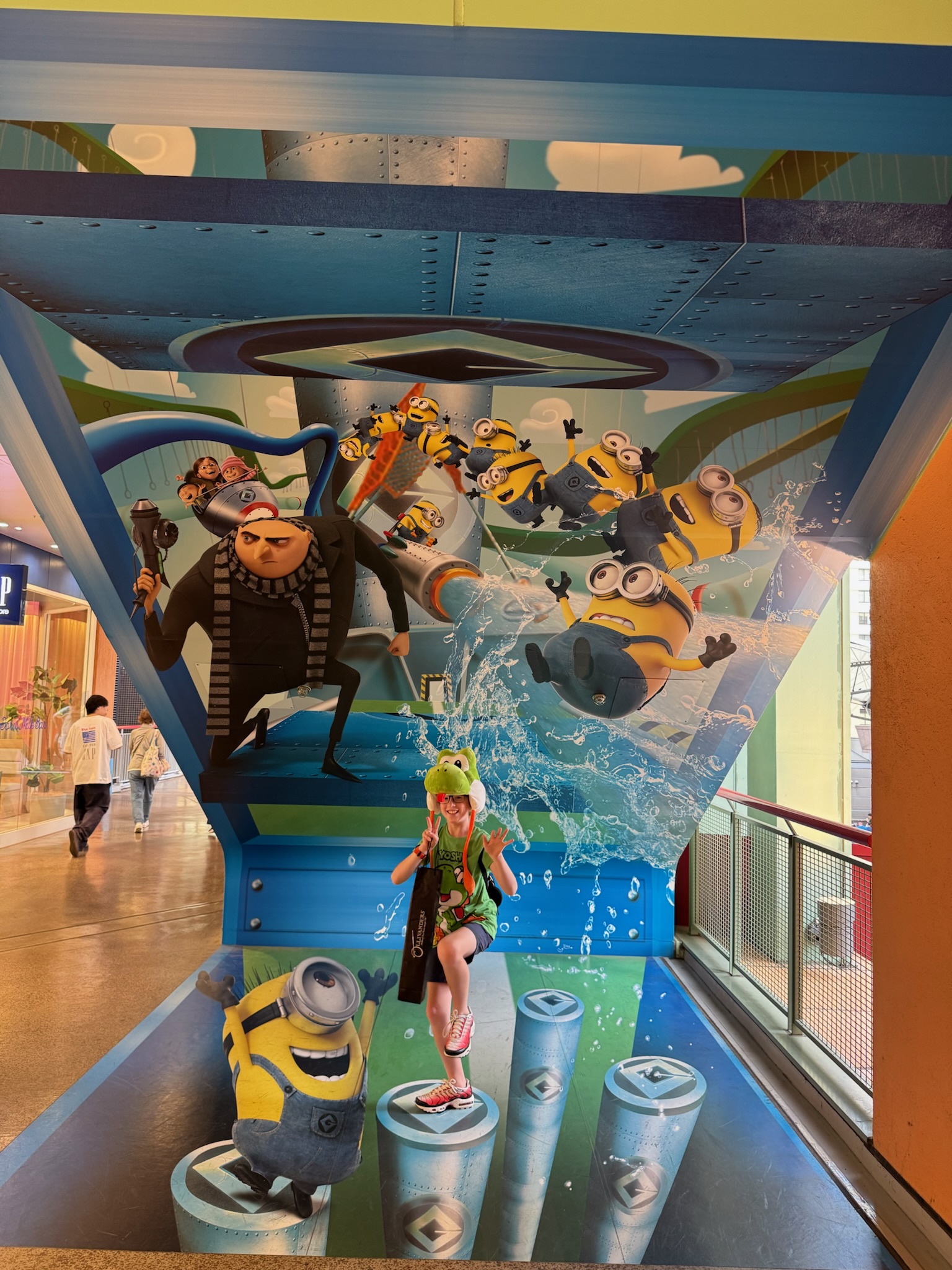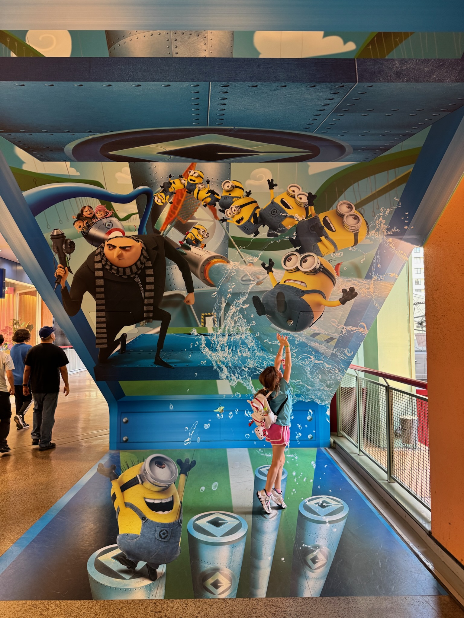 We started in the Hollywood section, then hit the Minion area for our first two rides. After that, we made our way to Jurassic Park. The sign warned we might get wet… but we weren’t prepared for a full-on soaking. As we stood in line, we saw people donning ponchos and started panicking about our passports getting wet. Thankfully, we had a Ziplock in our bag—originally for trash—which turned into an emergency waterproof pouch that we stuck our passports in. Smart thinking, because we got borderline soaked. The ride was totally worth it though—super fun!