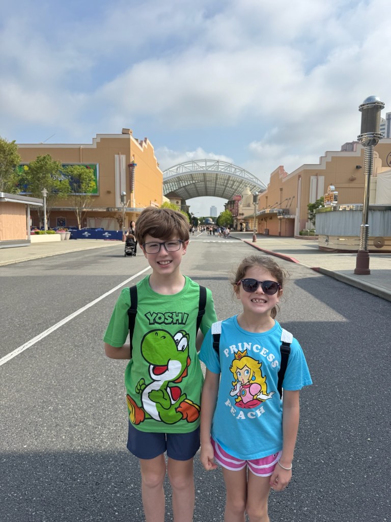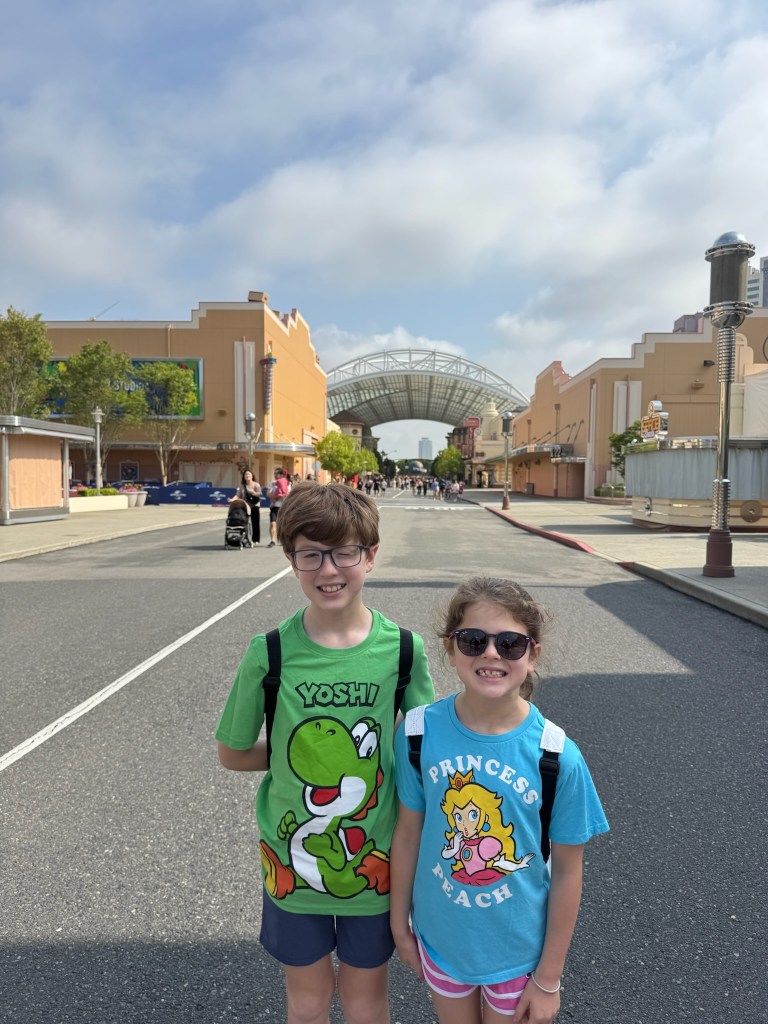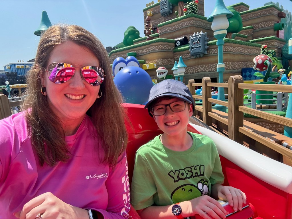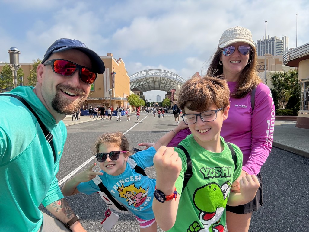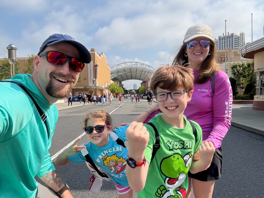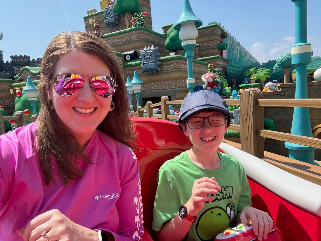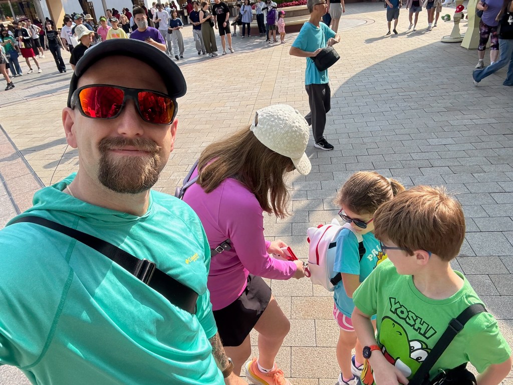 We decided to stay on schedule for our next two rides instead. After the second one, the kids and I went to the restroom while Tom waited in line for some ice cream. We met back in a shady tunnel, shared the treat, and headed to the Mario Kart ride on a whim—hoping they’d let us in late with our express pass.