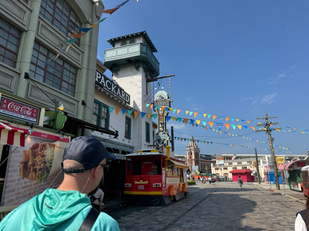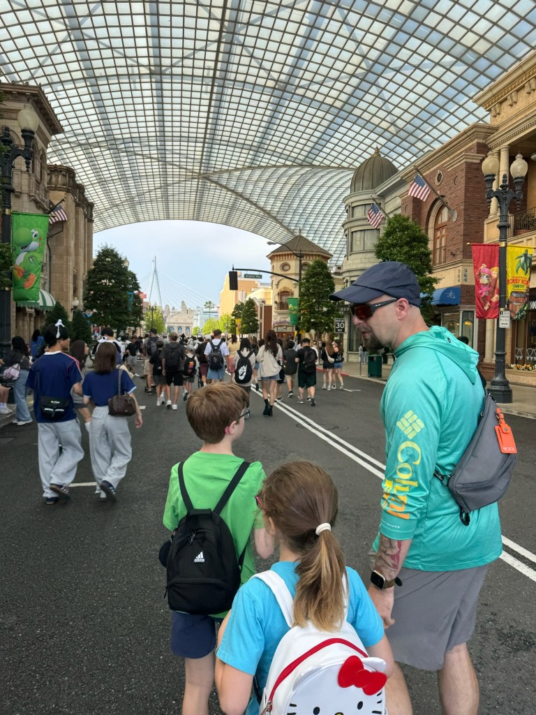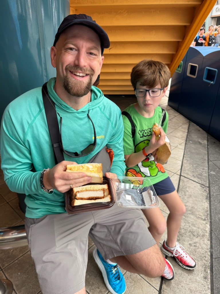 Once we were all up and dressed, we grabbed breakfast from Lawson’s and ate it outside on a horizontal pole that doubled as a bench. While we munched on our food, we watched a literal river of people streaming past us—thousands headed to Universal. It was wild!