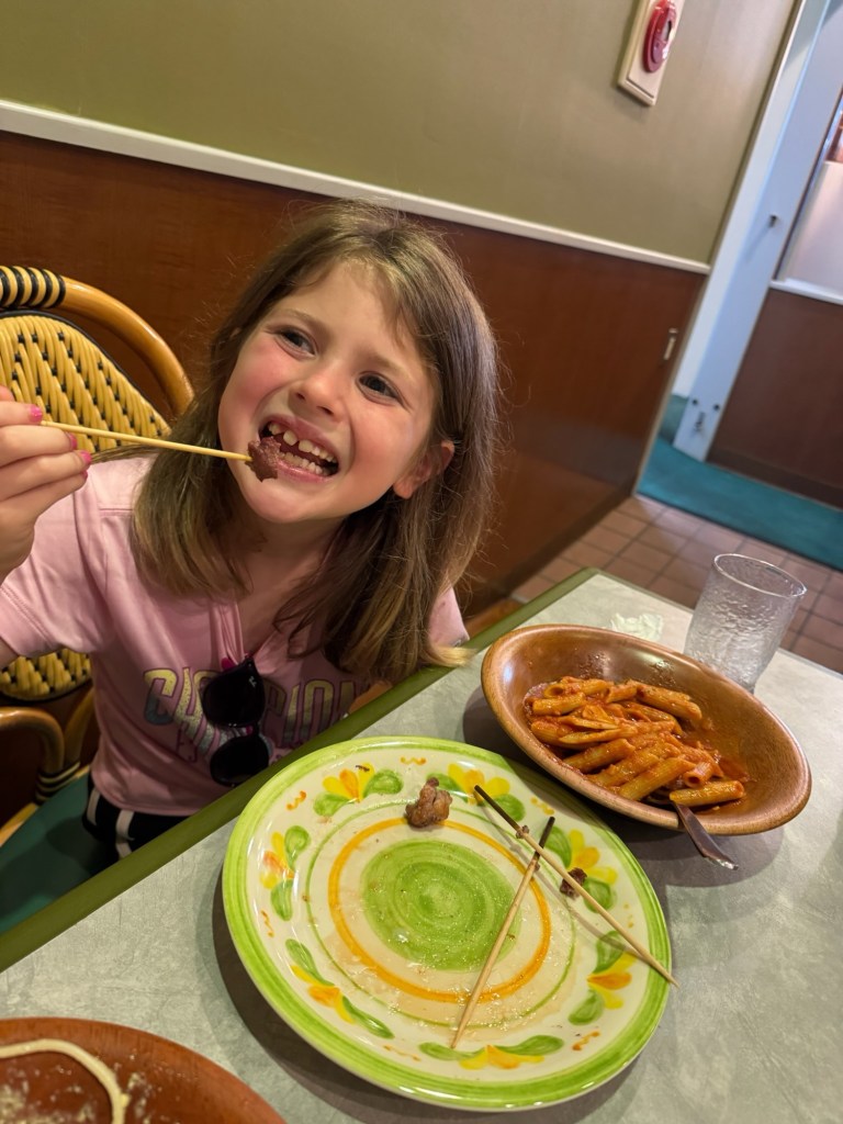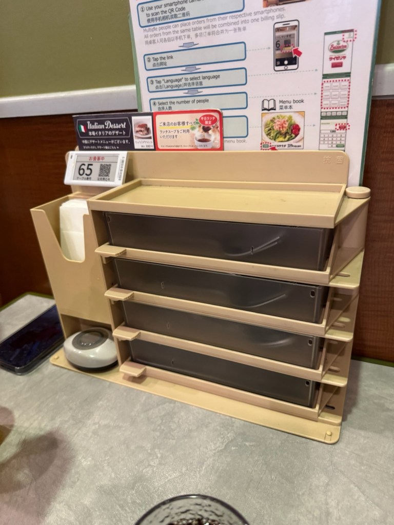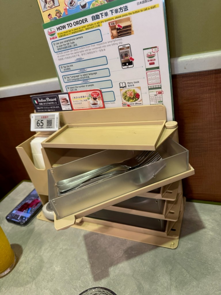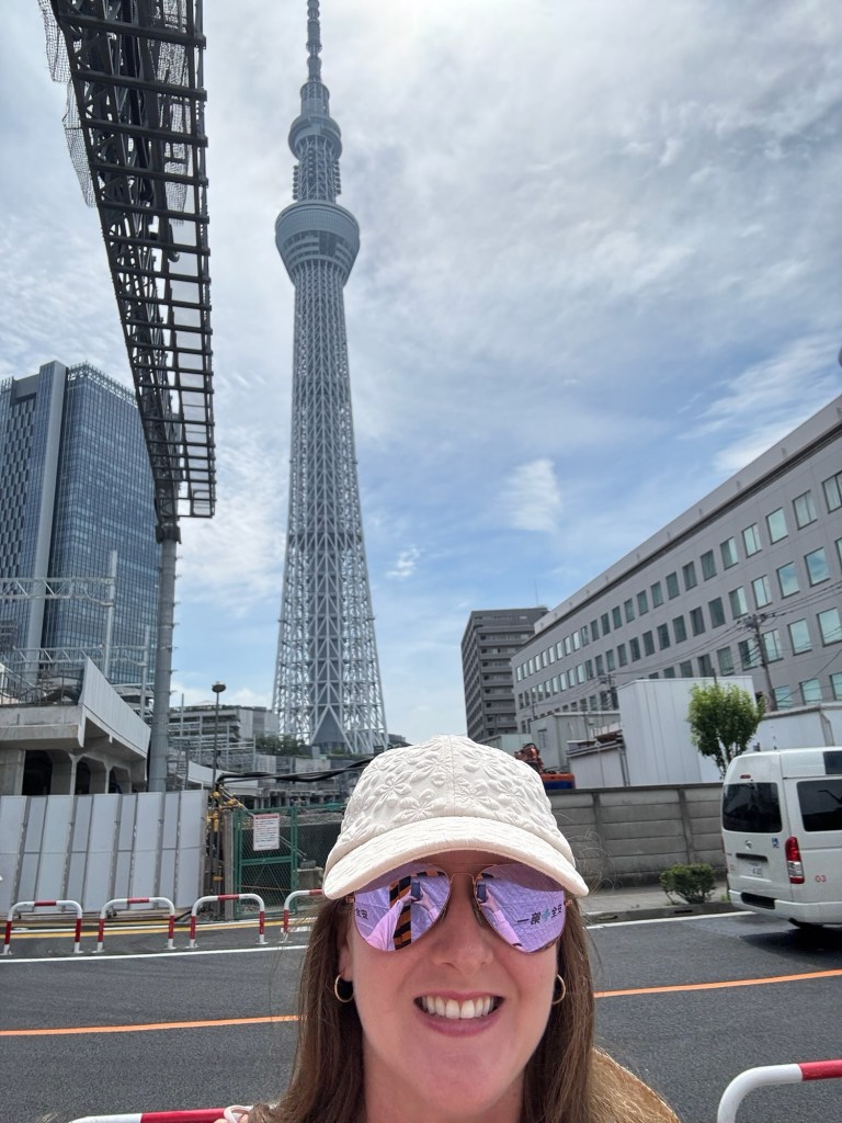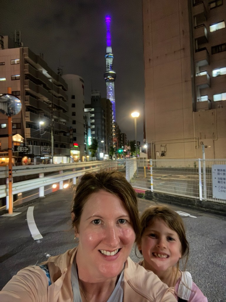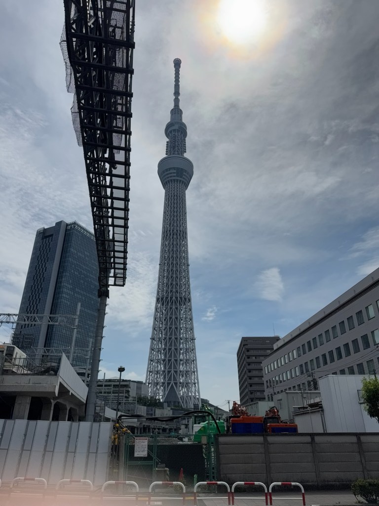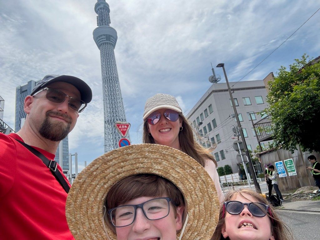 By the time we were out the door, it was after 11. Our goal for the day: walk to the famous Tokyo Skytree, and eat our way there. On the way, we stopped at Saizeriya, a Japanese chain that serves Italian food. Carlynn wasn’t thrilled with her pasta, but after swiping a bite of Charlie’s lamb skewer, she was converted. We ended up ordering two more just for her. Big parenting win watching her branch out! Charlie was obsessed with the spice mix that came with the skewers—it was so good we hunted it down at a conbini later and bought multiple bottles to take home. (Souvenirs? Check.)