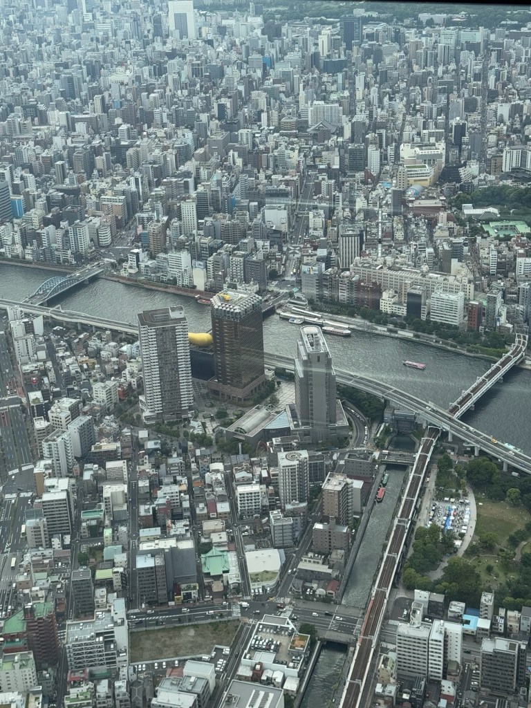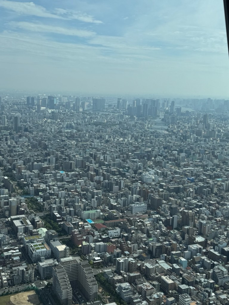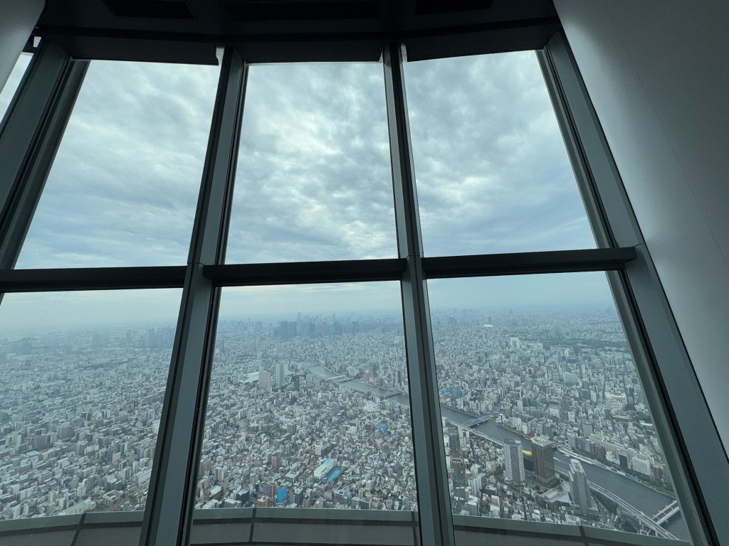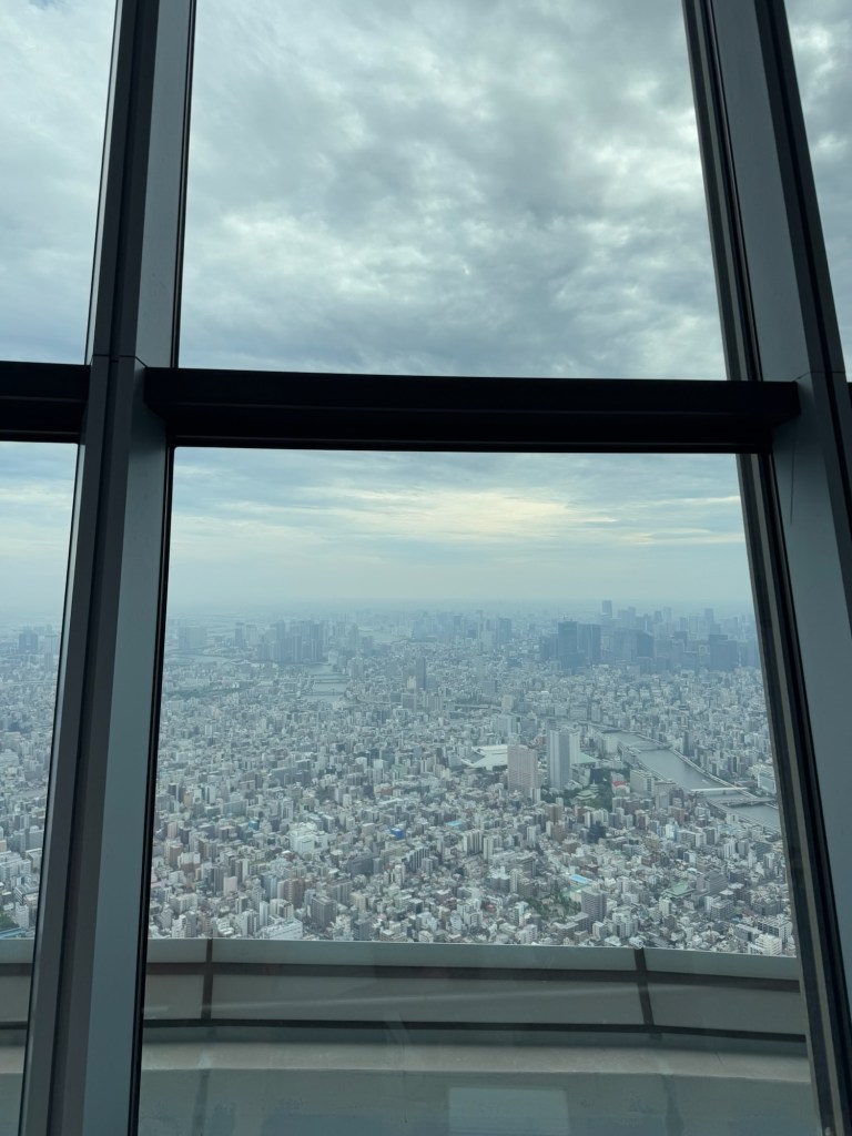 Finally, we reached the Tokyo Skytree. Tickets? Secured. Then we had about 15 minutes to roam before getting in the next line for our timed entry. The elevator ride up was wild—it showed how fast we were going, and my ears popped like we were on a plane. At the top, the views were insane. Tokyo stretched out in every direction like a never-ending sea of buildings and tiny cars.