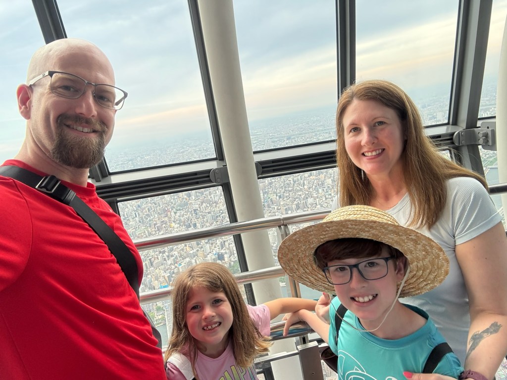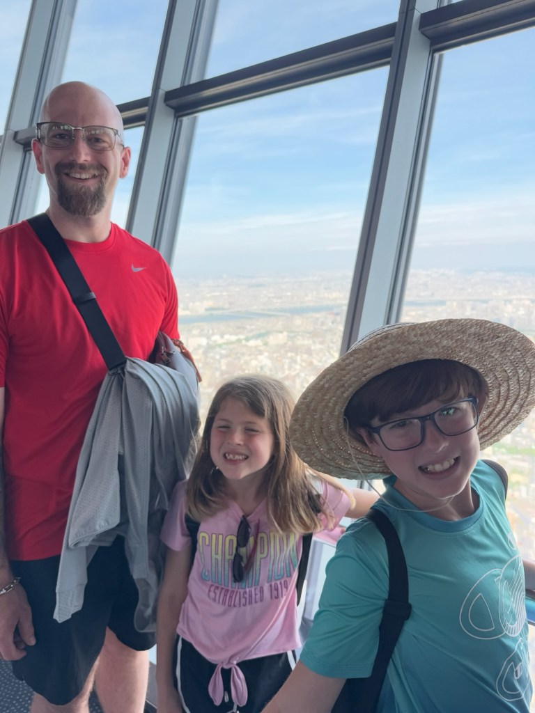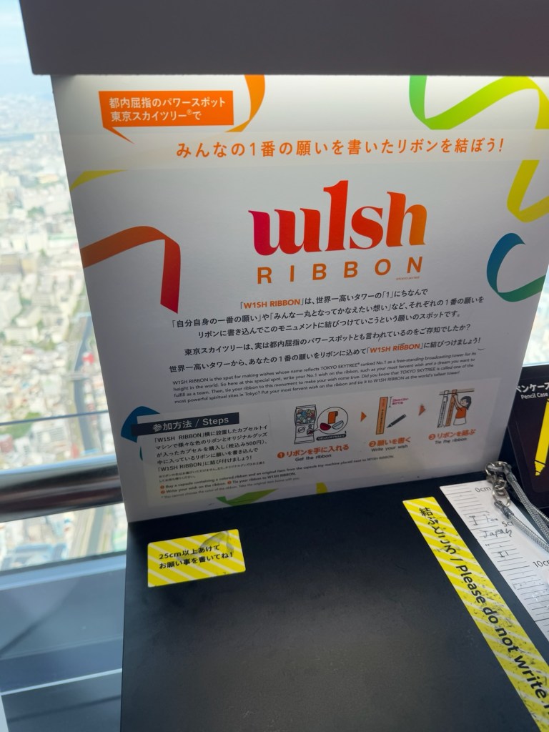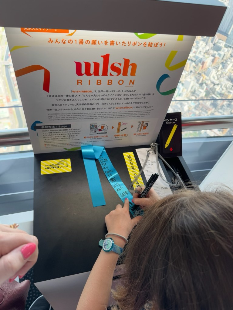 We paid 500 yen each to buy two capsules with ribbons to write wishes on and tie them up on a string. Carlynn dictated a sweet wish for me to write down, and Tom and Charlie did one together too. Then we took it even higher, using our combo tickets to go to the next observation level. We even braved the glass floor, which was super cool—although, shoutout to the parents who let their toddlers hog the space like it was a ball pit 🙃.