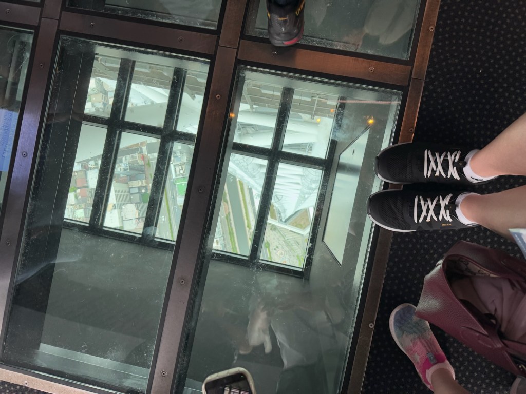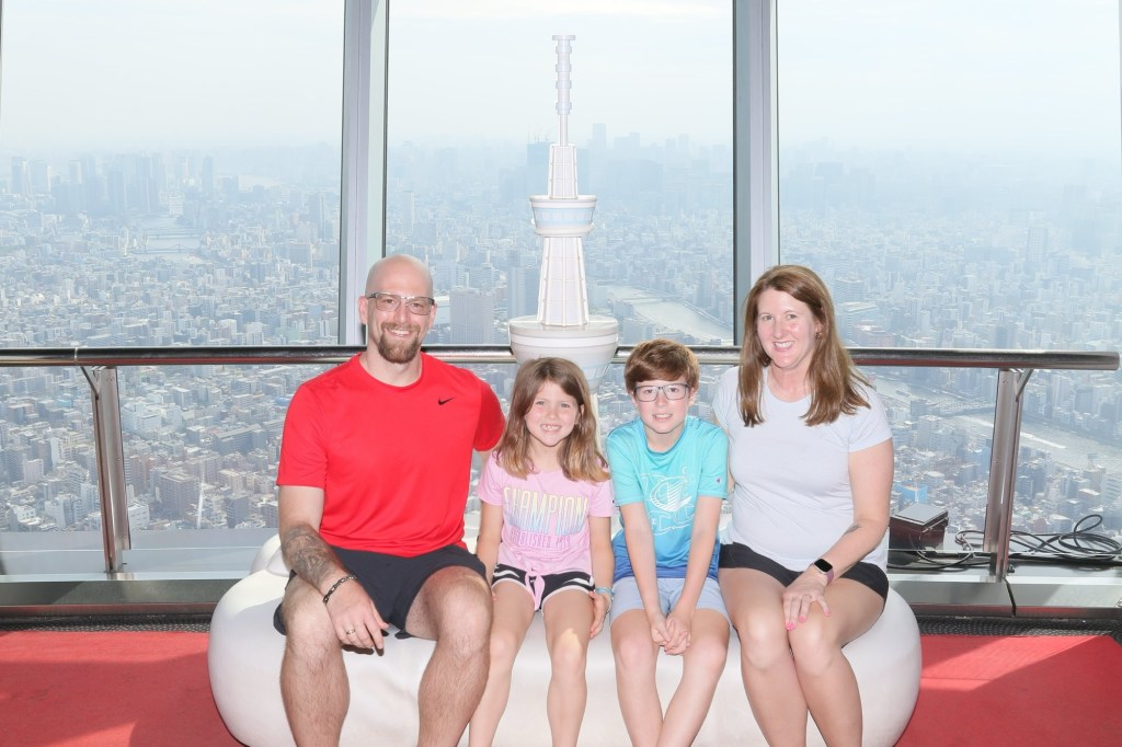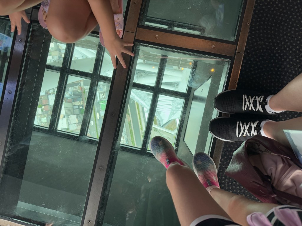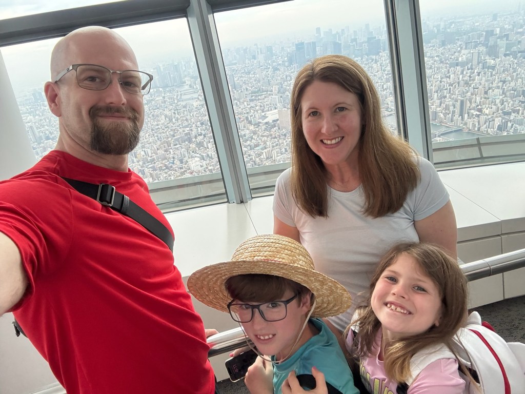 We paid 500 yen each to buy two capsules with ribbons to write wishes on and tie them up on a string. Carlynn dictated a sweet wish for me to write down, and Tom and Charlie did one together too. Then we took it even higher, using our combo tickets to go to the next observation level. We even braved the glass floor, which was super cool—although, shoutout to the parents who let their toddlers hog the space like it was a ball pit 🙃.