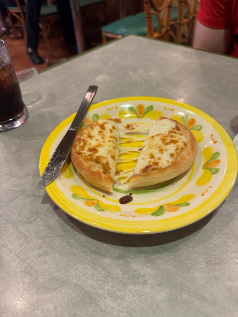 We split one piece of cheesy bread and instantly regretted not getting five. Cheesy, warm, dreamy perfection.