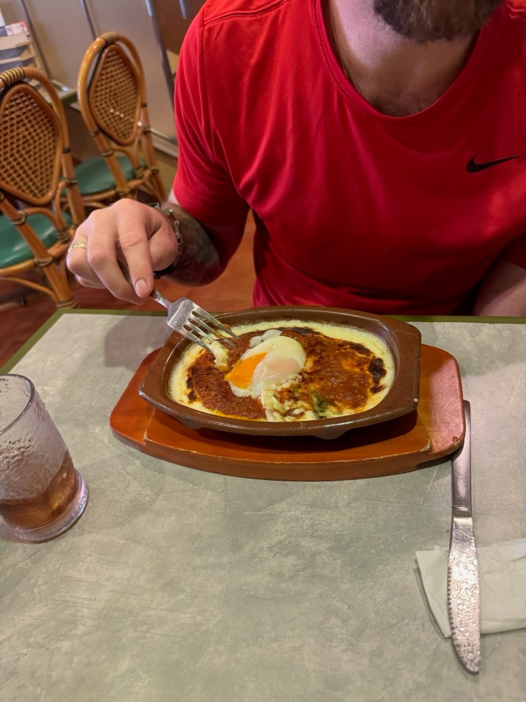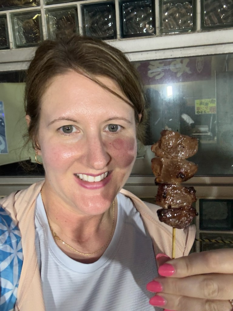 Then came… the skewer incident. Tom got 3 skewers (that we had assumed earlier was beef), one for me, Charlie and himself. I took a bite and paused. The texture was… different. Chewy. Tom and I exchanged a look of mild panic: “Uhh… this isn’t normal beef, is it?” I told him, “Don’t say a word until I’m done.” Carlynn tried a bite too—everyone was in.