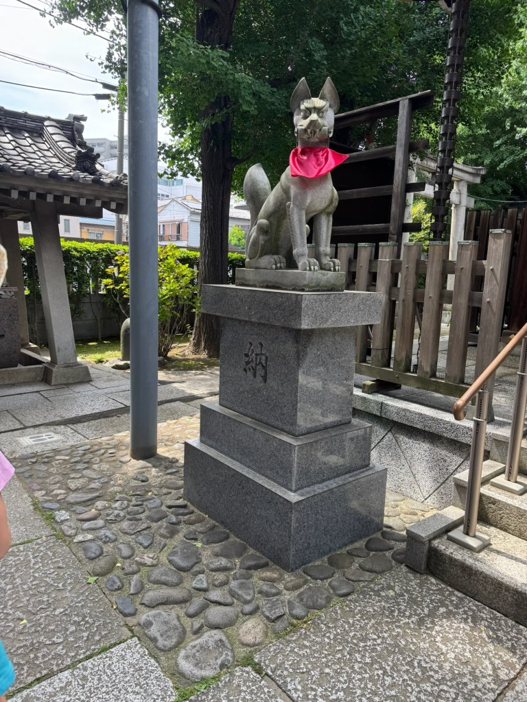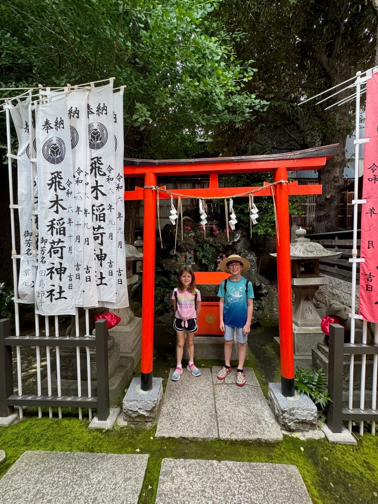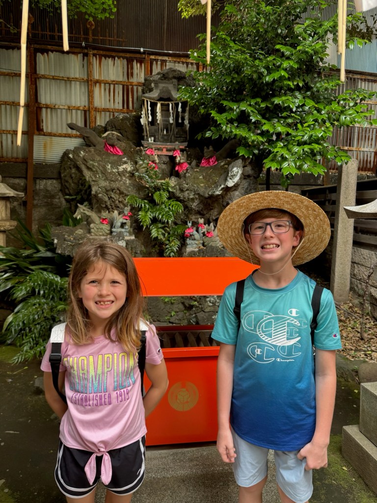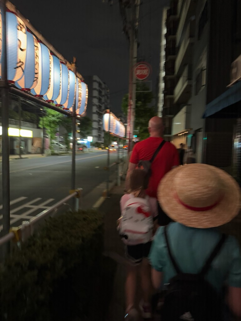 Bellies full (again), we continued our stroll to the Skytree. Along the way, we stumbled across a small shrine and a lively street filled with food and game vendors—it had all the buzz of a mini street fair. Of course, the kids wanted in. Charlie tried a shooting game where you launch corks at prizes—no win this time, but he got two pieces of bubble gum just for playing. Carlynn chose wisely, going for a lighter prize: a sticker sheet. She nailed it on the first shot and walked away victorious.