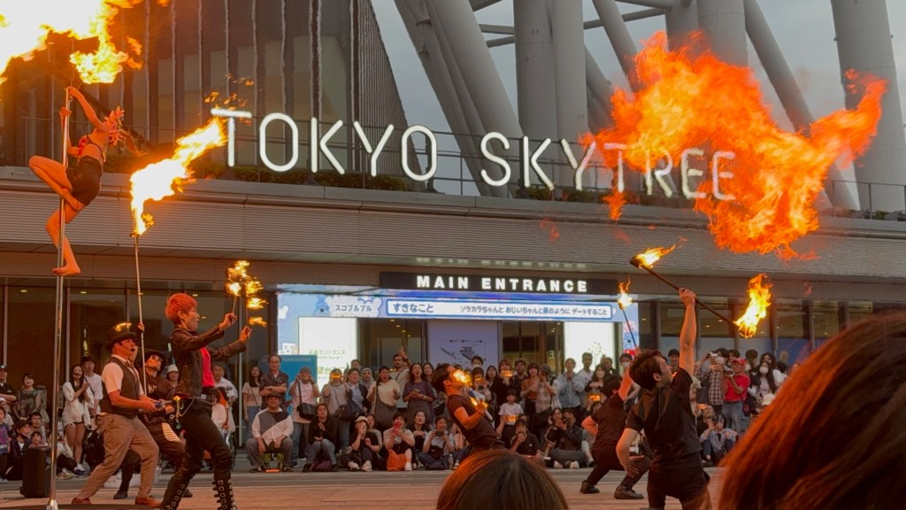 Once back on solid ground, we walked out of the Skytree building and noticed a crowd gathering. Street performers were setting up, so we paused to watch—and stayed because it was hilarious. The kids were glued to the performance, which was family-friendly and universally funny. Huge shoutout to @funnybonestokyo—you made our day! After the show, the kids gave a tip and got stickers. We saw another group setting up behind us and decided to stick around.