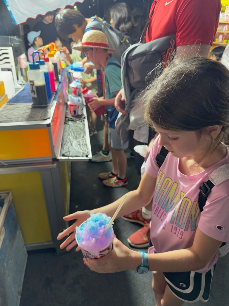 As the concert wound down, a woman began performing what looked like a traditional dance. The kids ended the night with Japanese shaved ice—self-serve flavoring, made with real ingredients, none of that chemical taste we’re used to. And guess what? Charlie gave the shooting game one more shot and won a prize this time!