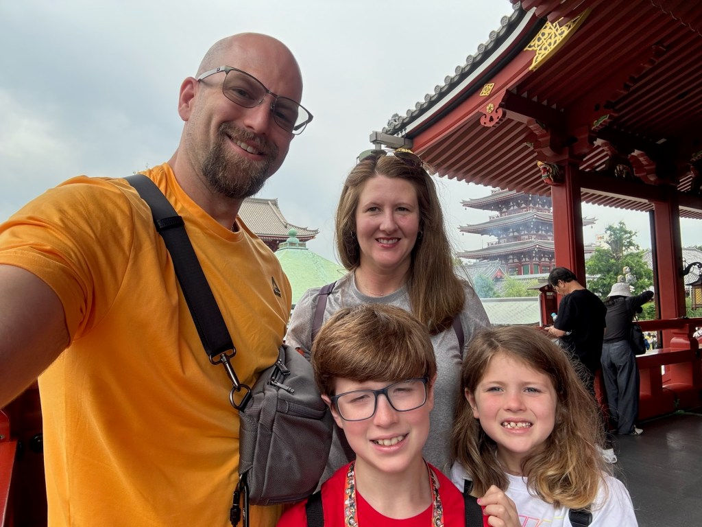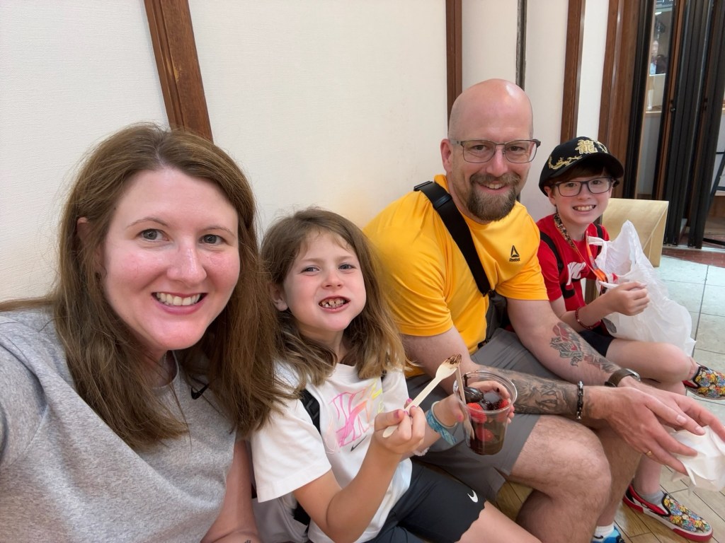 We picked up some temple charms and bracelets to lift our spirits, then dove into street food central. The kids grabbed shaved ice (which took them approximately forever to finish), Tom opted for pineapple on a stick, and I joined in with my own icy treat. There was also a goofy photo board—naturally, the kids and I stuck our heads in and Tom snapped the pic like the good sport he is.