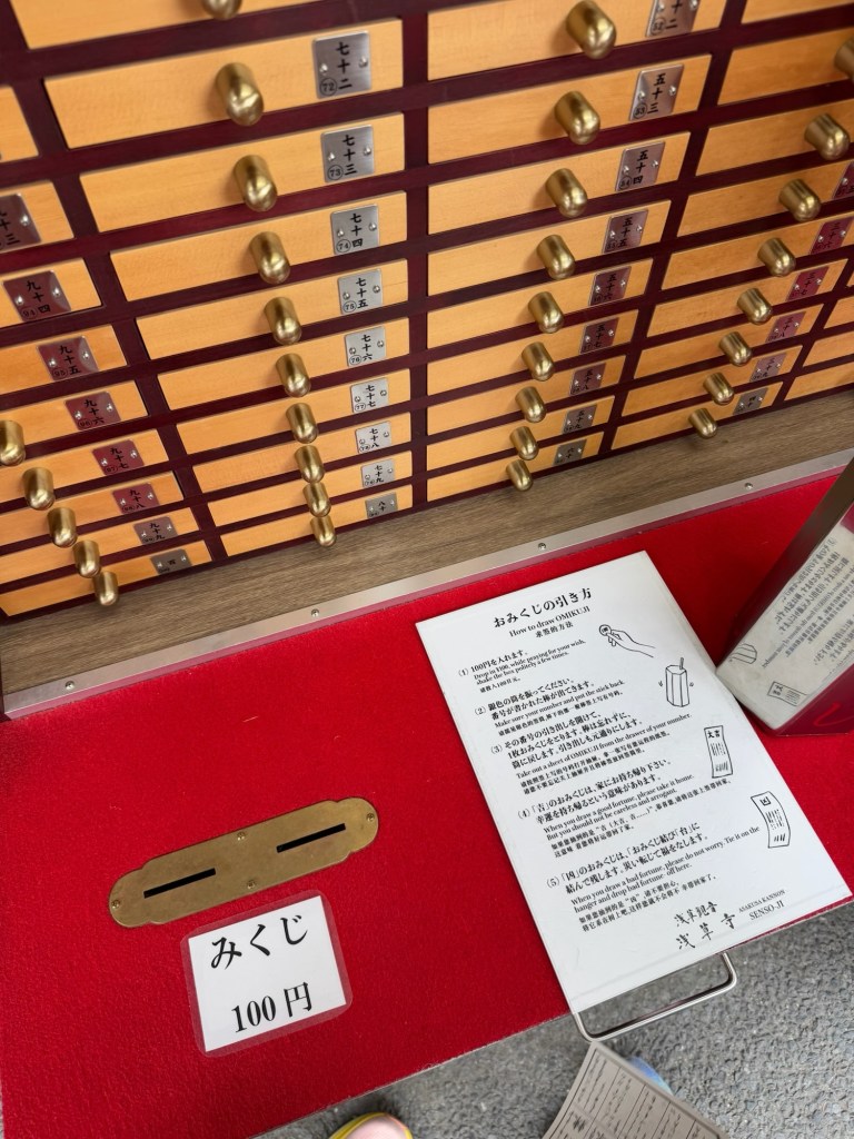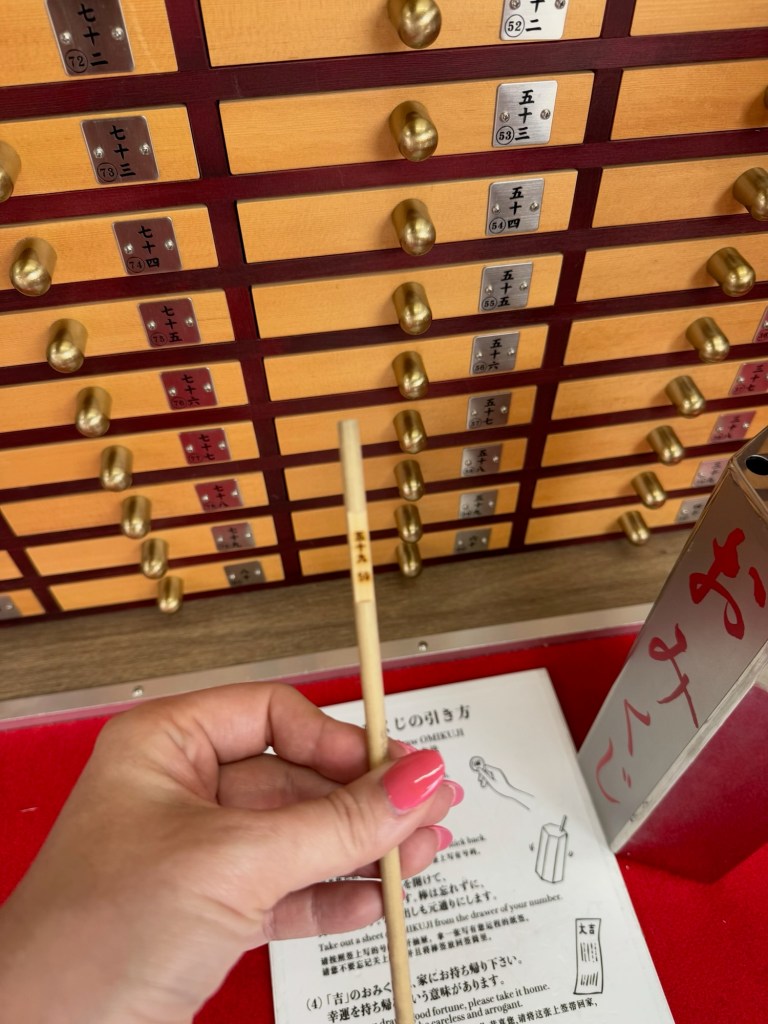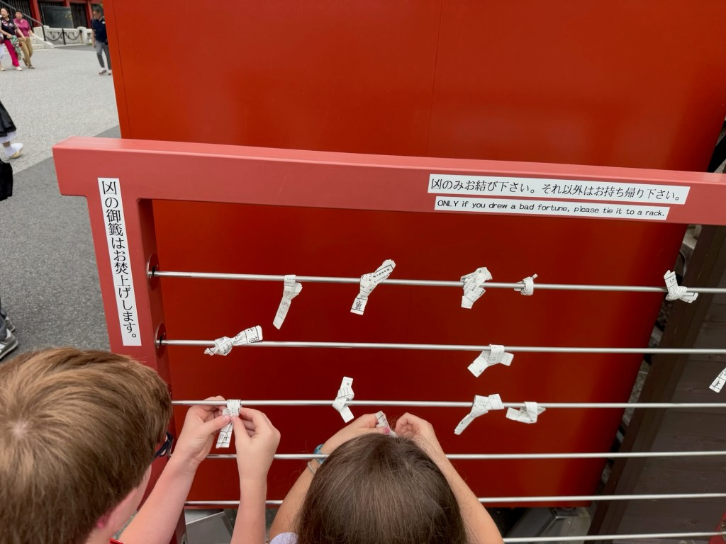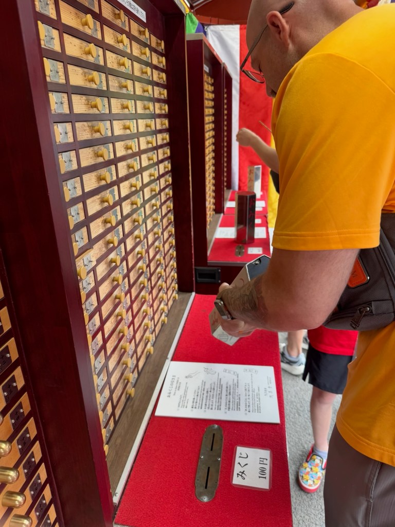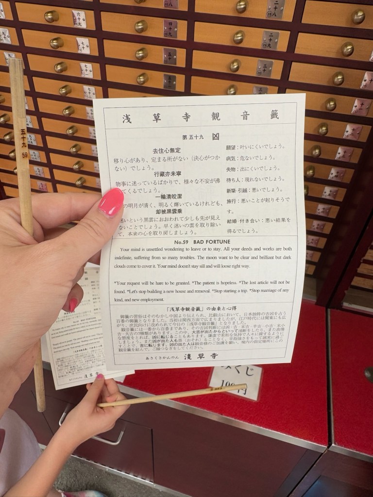 When we finally made it to Senso-ji, it was as beautiful as promised—and absolutely buzzing with people. We took in the grand temple architecture, snapped a few photos (in the designated areas!), and then it was time for… fortunes. For just 100 yen, we shook a box, drew a numbered stick, and pulled out our fates from a matching drawer. Drumroll… every single one of us got bad fortunes. All tied and left behind in the official “get-rid-of-your-bad-luck” zone. Let’s hope it worked.