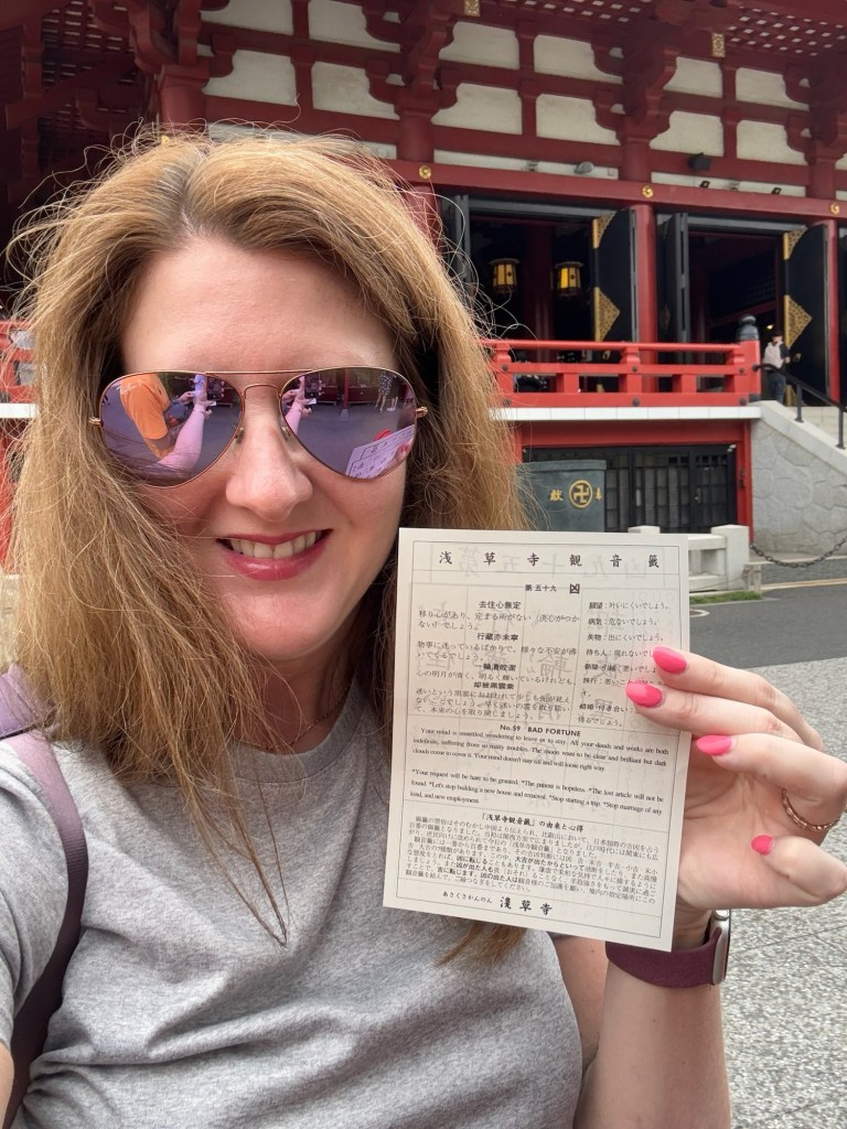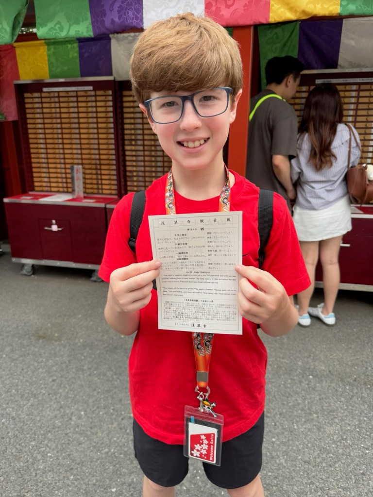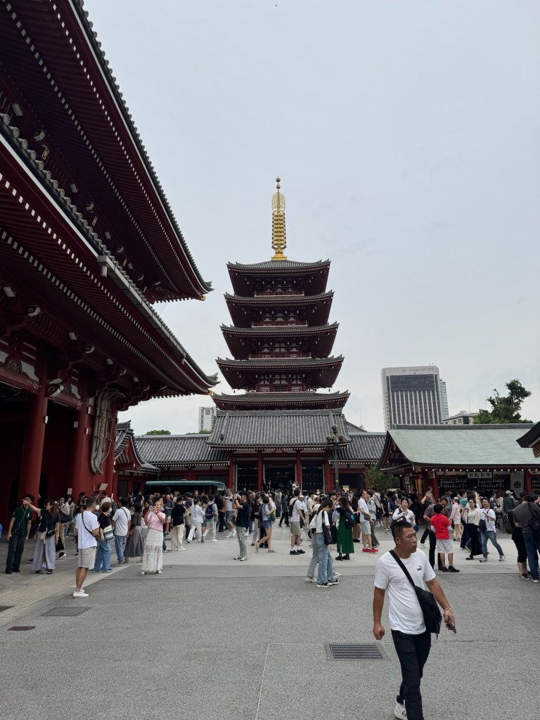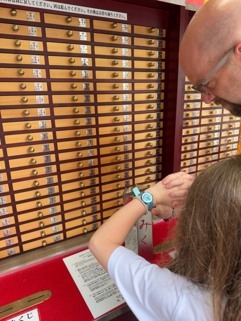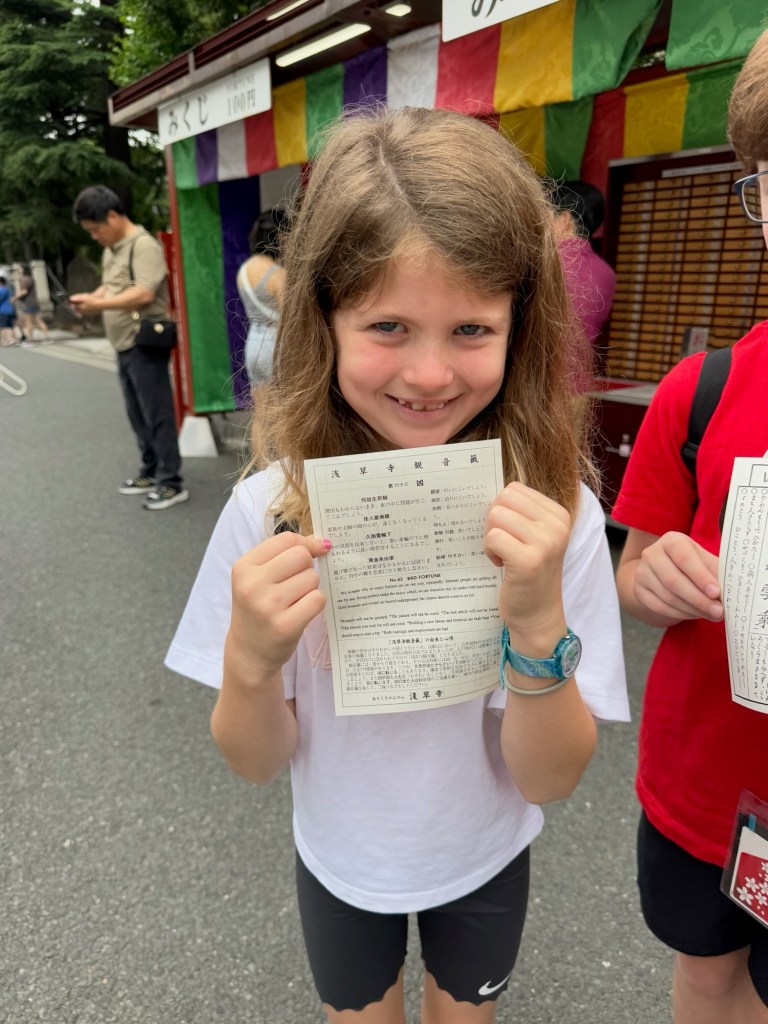 When we finally made it to Senso-ji, it was as beautiful as promised—and absolutely buzzing with people. We took in the grand temple architecture, snapped a few photos (in the designated areas!), and then it was time for… fortunes. For just 100 yen, we shook a box, drew a numbered stick, and pulled out our fates from a matching drawer. Drumroll… every single one of us got bad fortunes. All tied and left behind in the official “get-rid-of-your-bad-luck” zone. Let’s hope it worked.