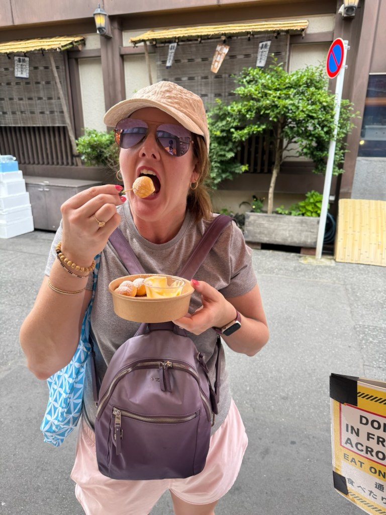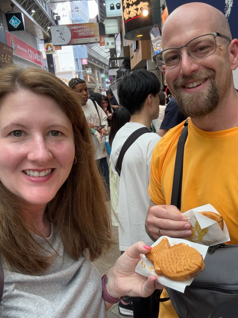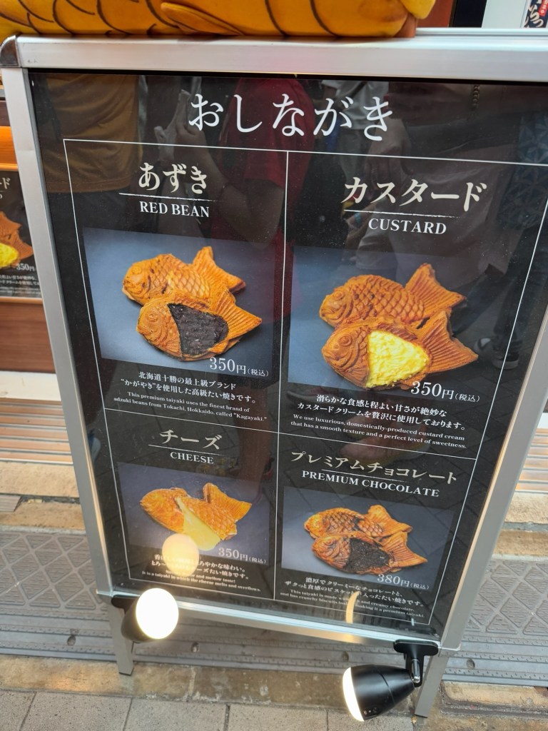 Then I spotted them: the fish-shaped pastries I’d been hunting for all trip—taiyaki! We tried one with gooey cheese (like melty Swiss!) and one with custard. Both were amazing, but the custard one was slightly less messy and maybe a little more magical.