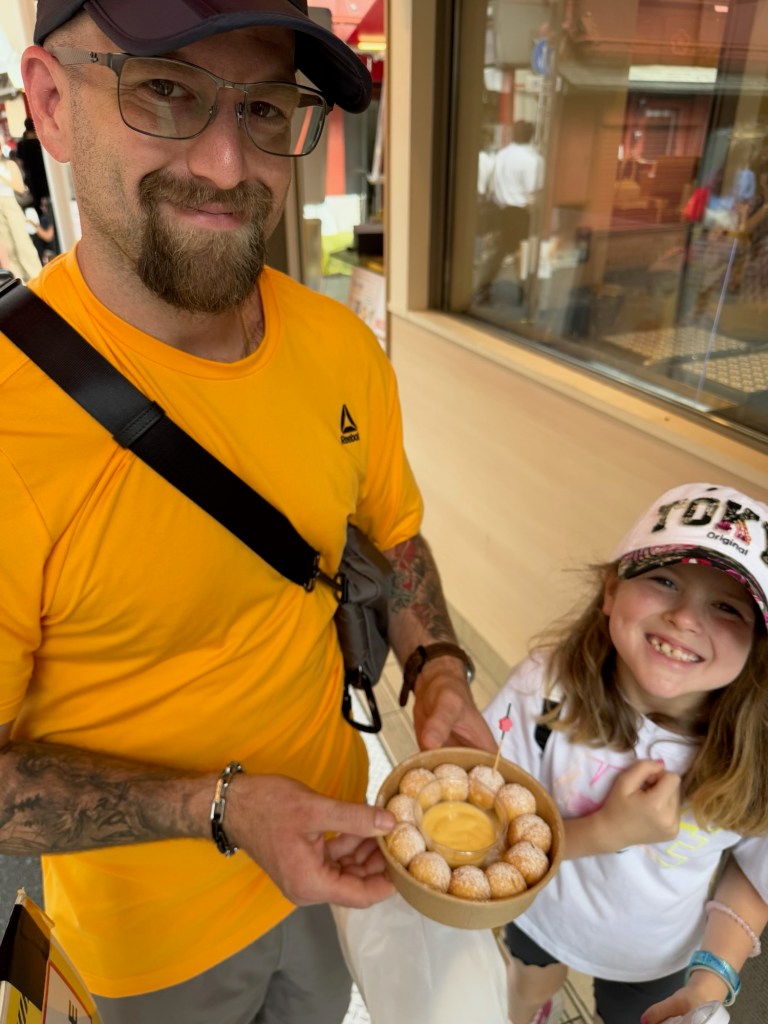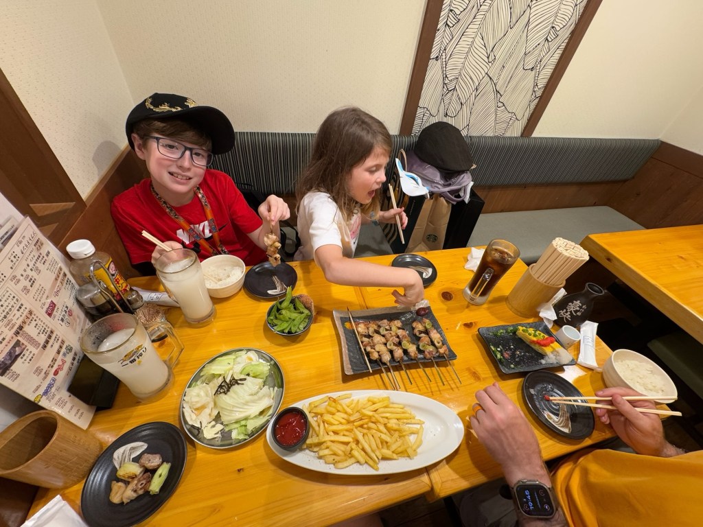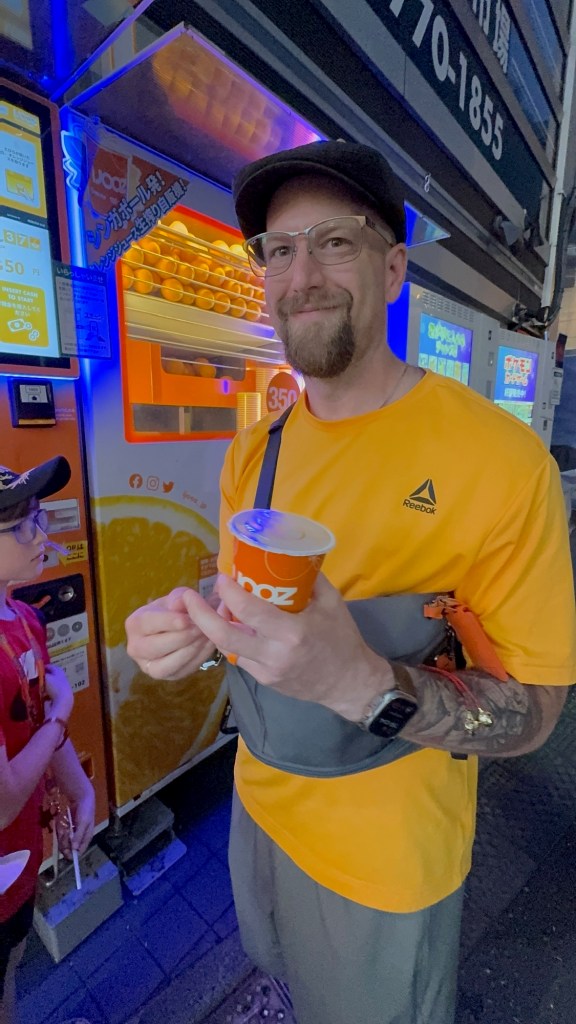 We tried Japanese sponge cake balls dipped in custard next, which were a hit—even Carlynn approved! We bought cute hats for the kids, and Charlie scored a One Piece-themed robe thingy (technical term). Then it was time for Carlynn’s new obsession: chocolate-covered strawberries. The strawberries? Juicy. The dark chocolate? Actually flavorful and not weirdly waxy like some back home. A+ snack.