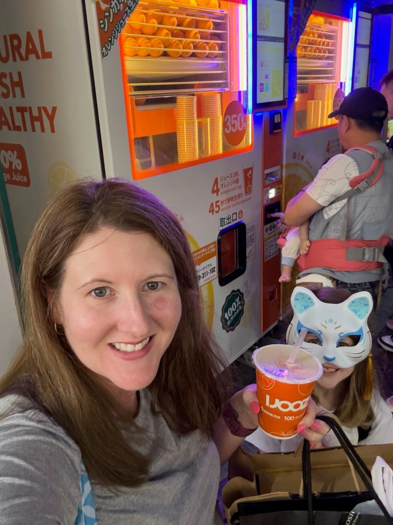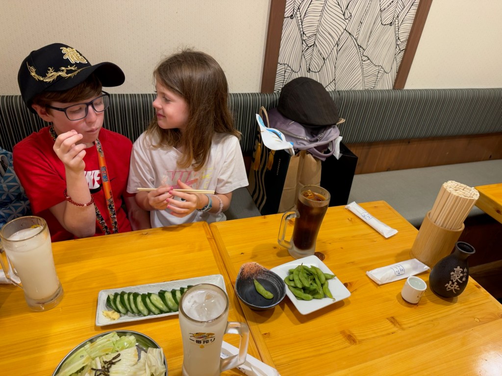 We refreshed with fresh-squeezed orange juice from a vending machine (because, Japan), then started the dinner hunt. We found a cozy bar-style restaurant and got seated on the third floor, where we had the entire space to ourselves for most of the meal. Apps: edamame and pickled cucumbers. Mains: charcoal-grilled chicken and green onion skewers (drool-worthy), rice, McDonald’s-style fries, and a calpis sour for me. We were stuffed, satisfied, and somehow the whole meal only cost about $40.