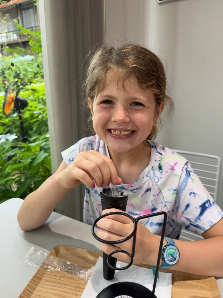 The sweetest discovery of the afternoon was a small café selling candied apples and shaved ice. Charlie picked a bright blue candied apple (a whole apple dipped in a hard candy coating, then sliced), while Carlynn ordered shaved ice made with real orange juice and mandarin slices. Tom and I decided to try some drinks—he had a whiskey soda, I went for a Japanese gin soda, and the kids sampled a “natural energy soda” lemonade with lemon, honey, ginger, and bamboo charcoal. Surprisingly delicious! The owner even brought us rice crackers on the side—salty and crunchy, though the kids weren’t fans.